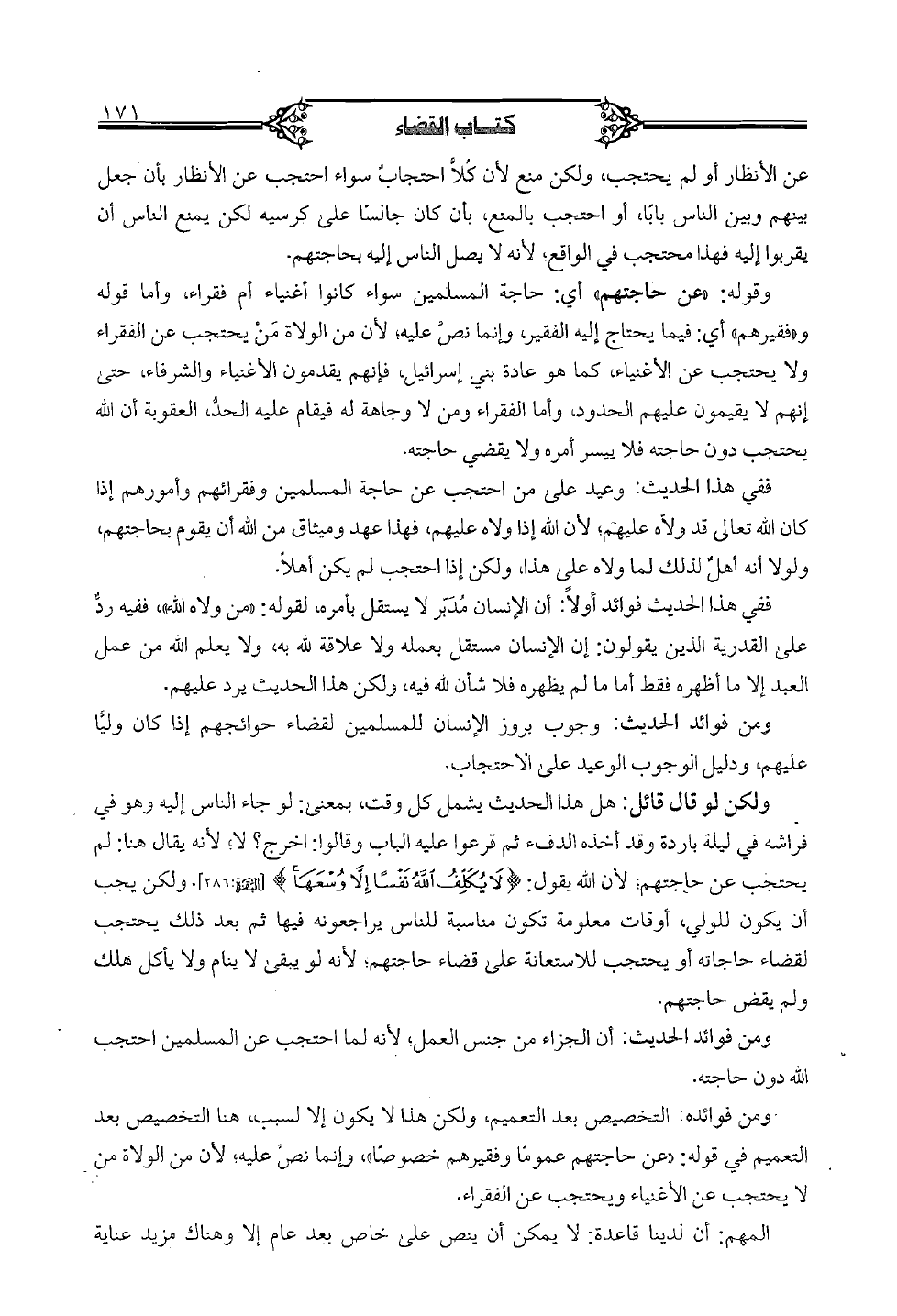 ولكن لو قال قائل: هل هذا الحديث يشمل كل وقت، بمعنى: لو جاء الناس إليه وهو في فراشة في ليلة باردة وقد أخذه الدفء ثم قرعوا عليه الباب وقالوا: اخرج؟ لا؛ لأنه لأنه يقال هنا: لم يحتجب عن حاجتهم؛ لأن الله يقول: {لا يكلف الله نفسا إلا وسعها} [البقرة: 286]. ولكن يجب أن يكون للولي، أوقات معلومة تكون مناسبة للناس يراجعونه فيها ثم بعد ذلك يحتجب لقضاء حاجاته أو يحتجب للاستعانة على قضاء حاجتهم؛ لأنه لو يبقى لا ينام ولا يأكل هلك ولم يقض حاجتهم.