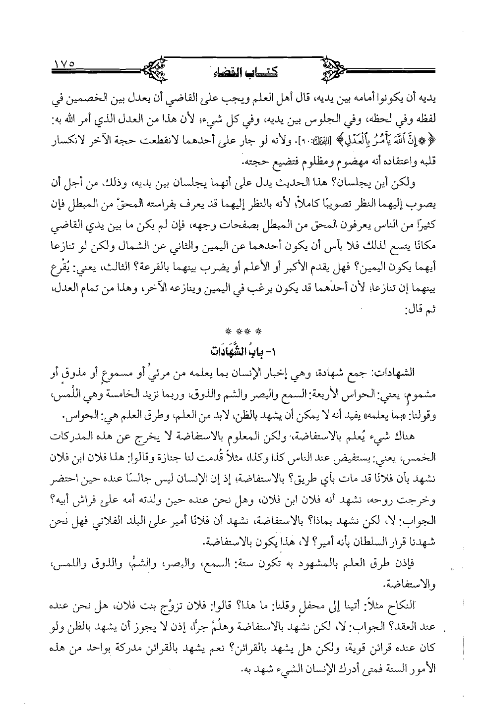 النكاح مثلا: أتينا إلى محفل وقلنا: ما هذا؟ قالوا: فلان تزوج بنت فلان، هل نحن عنده عند العقد؟ الجواب: لا، لكن نشهد بالاستفاضة وهلم جرا، إذن لا يجوز أن يشهد بالظن ولو كان عنده قرائن قوية، ولكن هل يشهد بالقرائن؟ نعم يشهد بالقرائن مدركة بواحد من هذه الأمور السيئة فمتى أدرك الإنسان الشيء شهد به.