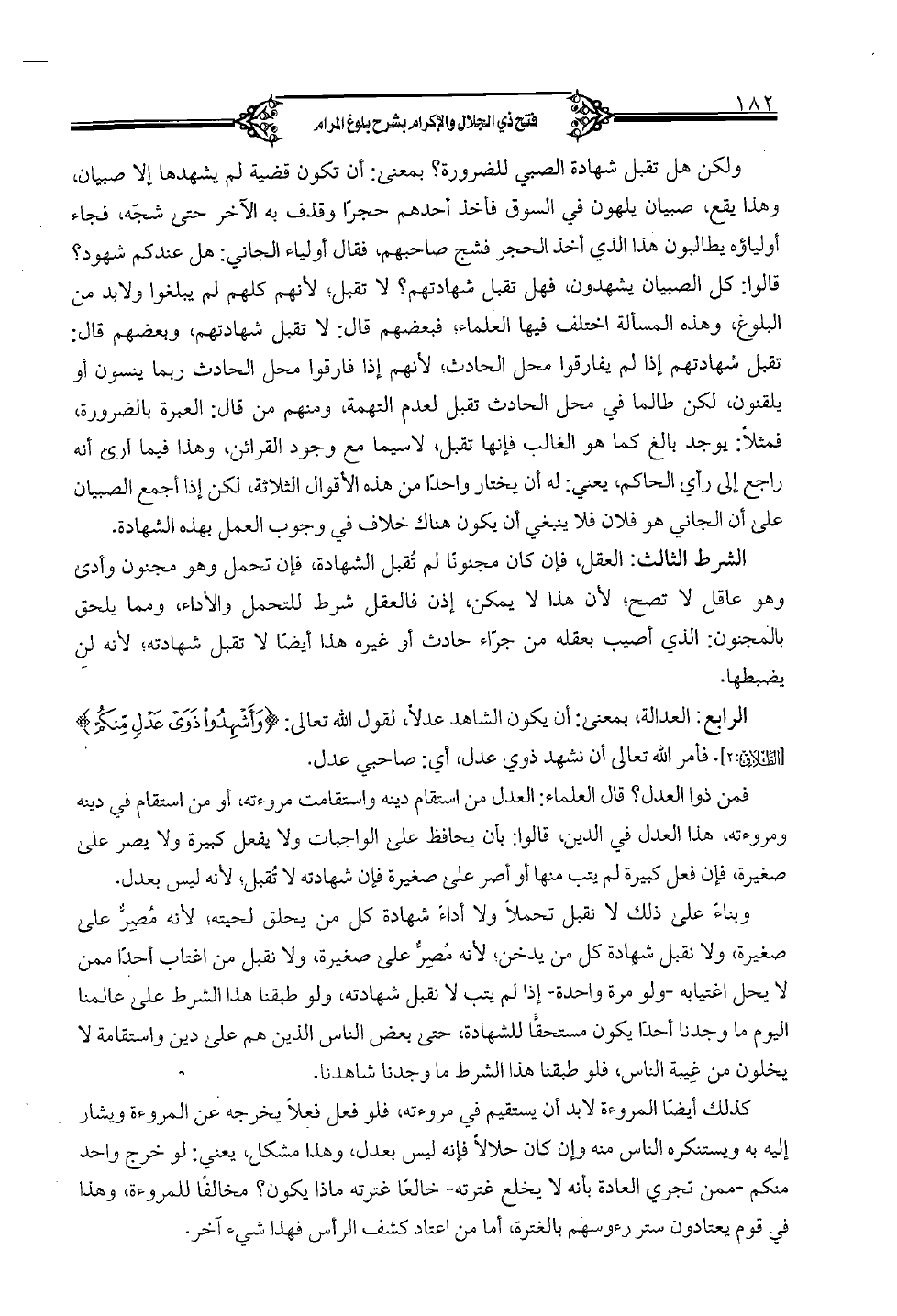 ولكن هل تقبل شهادة الصبي للضرورة؟ بمعنى: أن تكون قضية لم يشهدها إلا صبيان، وهذا يقع، صبيان يلهون في السوق فأخذ أحدهم حجرا وقذف به الآخر حتى شجه، فجاء أولياؤه يطالبون هذا الذي أخذ الحجر فشج صاحبهم، فقال أولياء الجاني: هل عندكم شهود؟ قالوا: كل الصبيان يشهدون، فهل تقبل شهادتهم؟ لا تقبل؛ لأنهم كلهم لم يبلغوا ولابد من البلوغ، وهذه المسألة اختلف فيها العلماء؛ فبعضهم قال: لا تقبل شهادتهم، وبعضهم قال: تقبل شهادتهم إذا لم يفارقوا محل الحادث؛ لأنهم إذا فارقوا محل الحادث ربما ينسون أو يلقنون، لكن طالما في محل الحادث تقبل لعدم التهمة، ومنهم من قال: العبرة بالضرورة، فمثلا: يوجد بالغ كما هو البالغ فإنها تقبل، لاسيما مع وجود القرائن، وهذا فيما أرى أنه راجع إلى رأي الحاكم، يعني: له أن يختار واحدا من هذه الأقوال الثلاثة، لكن إذا أجمع الصبيان على أن الجاني هو فلان فلا ينبغي أن يكون هناك خلاف في وجوب العمل بهذه الشهادة.