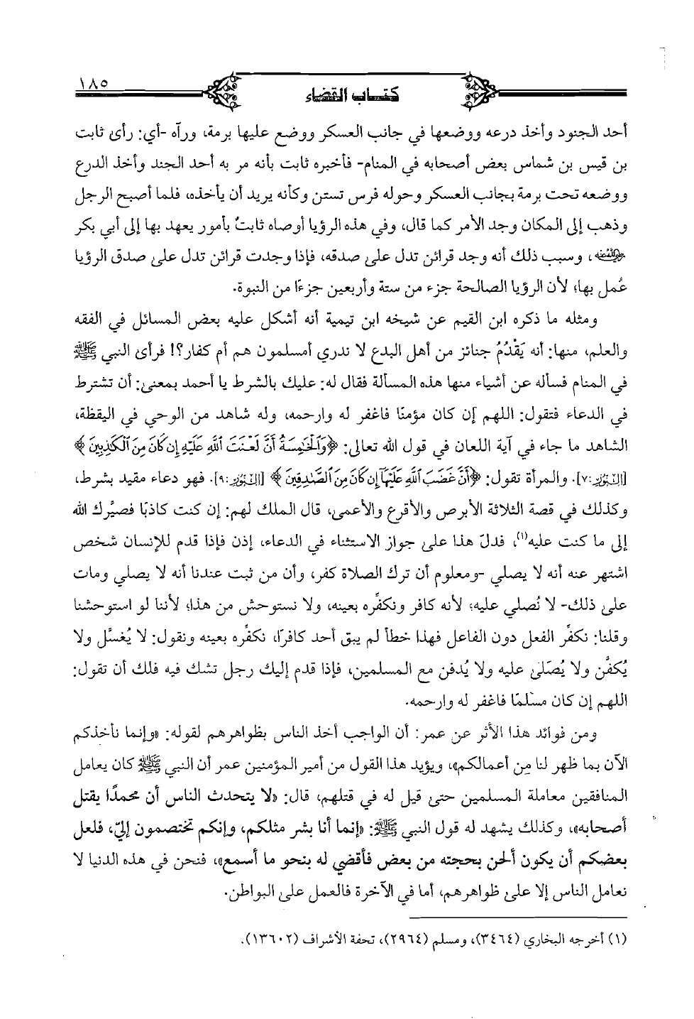 ومثله ما ذكره ابن القيم عن شيخه ابن تيمية أنه أشكل عليه بعض المسائل في الفقه والعلم، منها: أنه يقدم جنائز من أهل البدع لا تدري أمسلمون هم أم كفار؟ ! فرأى النبي صلى الله عليه وسلم في المنام فأسله عن أشياء منها هذه المسألة فقال له: عليك بالشرط يا أحمد بمعنى: أن تشترط في الدعاء فتقول: اللهم إن كان مؤمنا فاغفر له وارحمه، وله شاهد من الوحي في اليقظة، الشاهد ما جاء في آية اللعان في قوله تعالى: {والخامسة أن لعنت الله عليه إن كان من الكاذبين} [النور: 7]. والمرأة تقول: {أن غضب الله عليها إن كان من الصادقين} [النور: 9]. فهو دعاء مقيد بشرط، وكذلك في قصة الثلاثة أبرص والأقرع والأعمى، قال الملك لهم: إن كنت كاذبا فصيرك الله إلى ما كنت عليه، فدل هذا على جواز الاستثناء في الدعاء، إذن فإذا قدم للإنسان شخص اشتهر عنه أنه لا يصلي -ومعلوم أن ترك الصلاة كفر، وأن من ثبت عندنا أنه لا يصلي ومات على ذلك -لا نصلي عليه؛ لأنه كافر ونكفره بعينه، ولا نستوحش من هذا؛ لأننا لو استوحشنا وقلنا: نفكر الفعل دون الفاعل فهذا خطأ لم يبق أحد كافرا، نكفره بعينه ونقول: لا يغسل ولا يكفن ولا يصلى عليه ولا يدفن مع المسلمين، فإذا قدم إليك رجل تشك فيه فلك أن تقول: اللهم إن كان مسلما فاغفر له وارحمه.