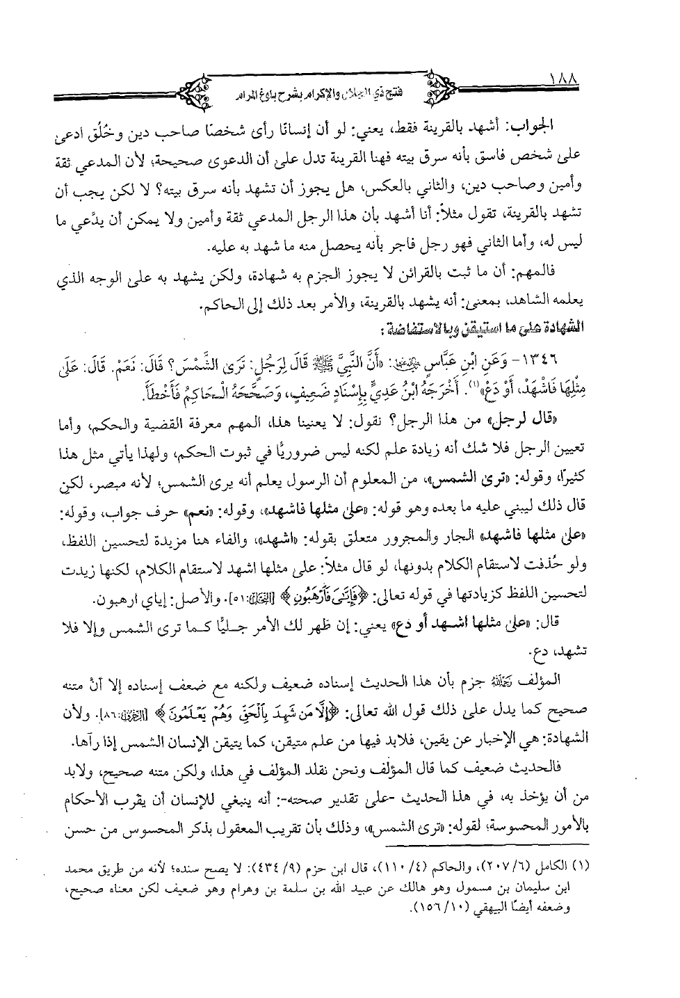 1346 - وعن ابن عباس رضي الله عنه: «أن النبي صلى الله عليه وسلم قال لرجل: ترى الشمس؟ قال: نعم. قال: على مثلها فاشهد، أو دع». أخرجه ابن عدي بإسناد ضعيف، وصححه الحاكم فأخطأ.