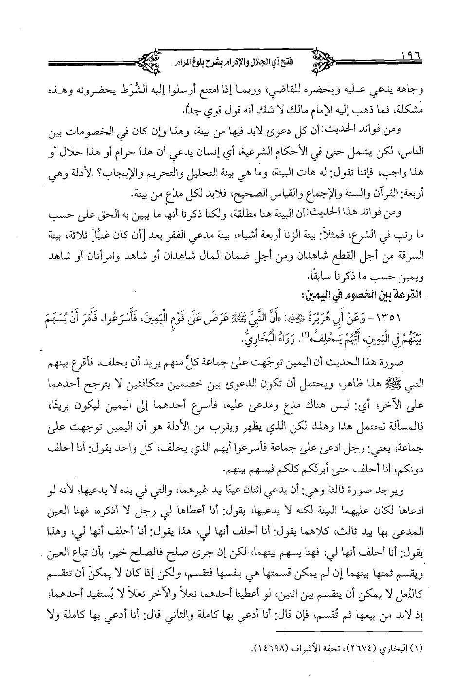 1351 - وعن أبي هريرة رضي الله عنه: «أن النبي صلى الله عليه وسلم عرض على قوم اليمين، فأسرعوا، فأمر أن يسهم بينهم في اليمين، أيهم يحلف». رواه البخاري.