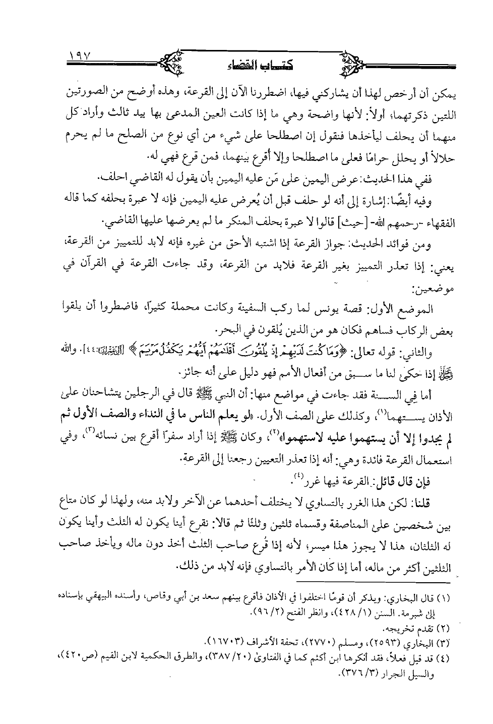 أما في السنة فقد جاءت في مواضع منها: أن النبي صلى الله عليه وسلم قال في الرجلين يتشاحنان على الأذان يستهما، وكذلك على الصف الأول. "لو يعلم الناس ما في النداء والصف الأول ثم لم يجدوا إلا أن يستهموا عليه لاستهموا"، وكان صلى الله عليه وسلم إذا أراد سفرا أقرع بين نسائه، وفي استعمال القرعة فائدة وهي: أنه إذا تعذر التعيين رجعنا إلى القرعة.