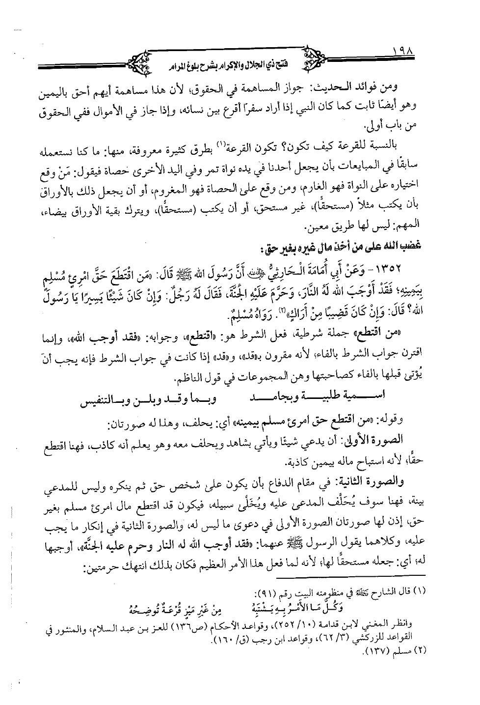 والصورة الثانية: في مقام الدفاع بأن يكون على شخص حق ثم ينكره وليس للمدعي بينة، فهنا سوف يحلف المدعى عليه ويخلى سبيله، فيكون قد اقتطع مال امرئ مسلم بغير حق، إذا لها صورتان الصورة الأولى في دعوى ما ليس له، والصورة الثانية في إنكار ما يجب عليه، وكلاهما يقول الرسول صلى الله عليه وسلم عنهما: «فقد أوجب الله له النار وحرم عليه الجنة»، أوجبها له؛ أي: جعله مستحقا لها؛ لأنه لما فعل هذا الأمر العظيم فكان بذلك انتهك حرمتين: