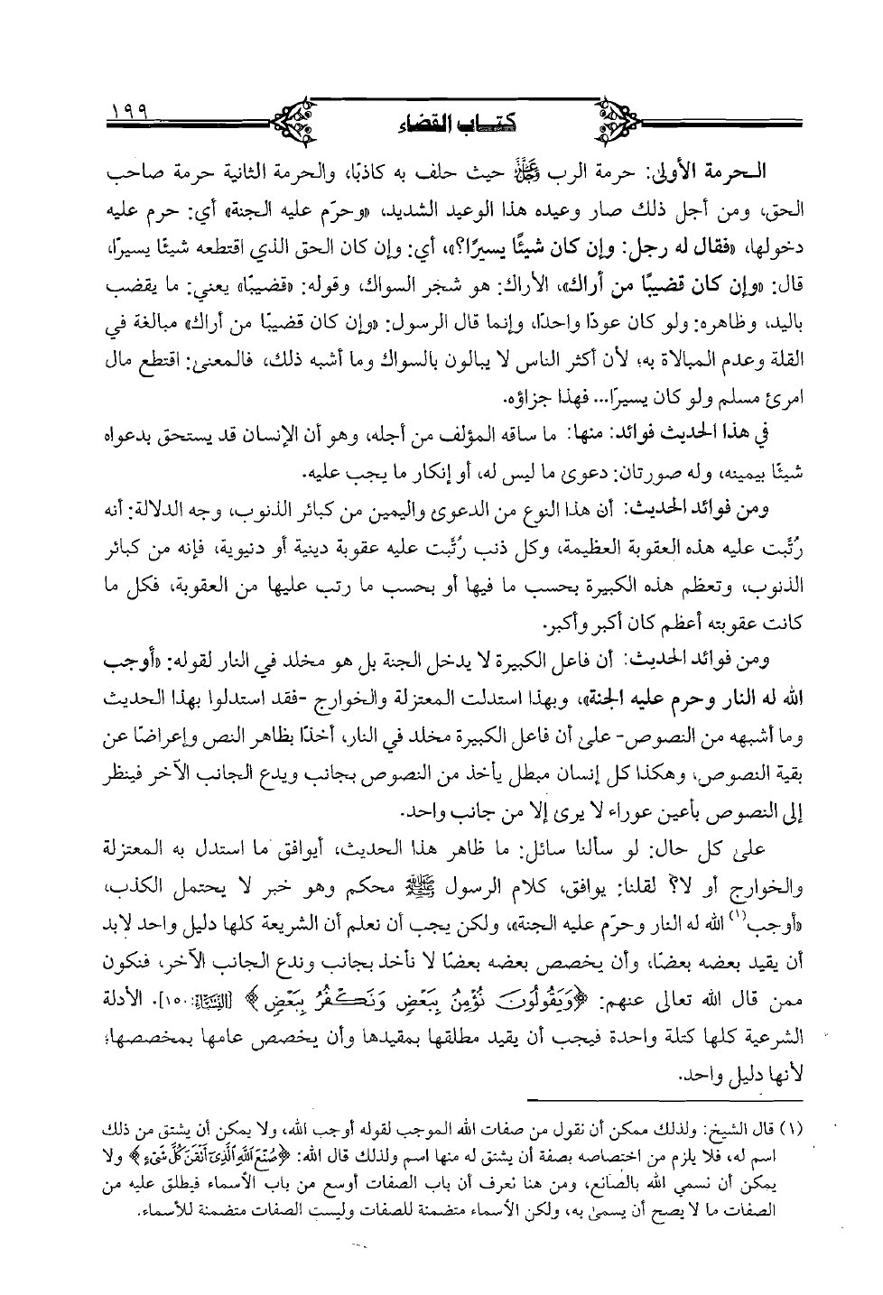 الحرمة الأولى: حرمة الرب عز وجل حيث حلف به كاذبا، والحرمة الثانية حرمة صاحب الحق، ومن أجل ذلك صار وعيده هذا الوعيد الشديد، "وحرم عليه الجنة" أي: حرم عليه دخولها، "فقال له رجل: وإن كان شيئا يسيرا؟ "، أي: وإن كان الحق الذي اقتطعه شيئا يسيرا، قال: و"وإن كان قضيبا من أراك"، الأراك: هو شجر السواك، وقوله: "قضيبا" يعني: ما يقضب باليد، وظاهره: ولو كان عودا واحدا، وإنما قال الرسول: «وإن كان قضيبا من أراك" مبالغة في القلة وعدم المبالاة به؛ لأن أكثر الناس لا يبالون بالسواك وما أشبه ذلك، فالمعنى: اقتطع مال امرئ مسلم ولو كان يسيرا ... فهذا جزاؤه.