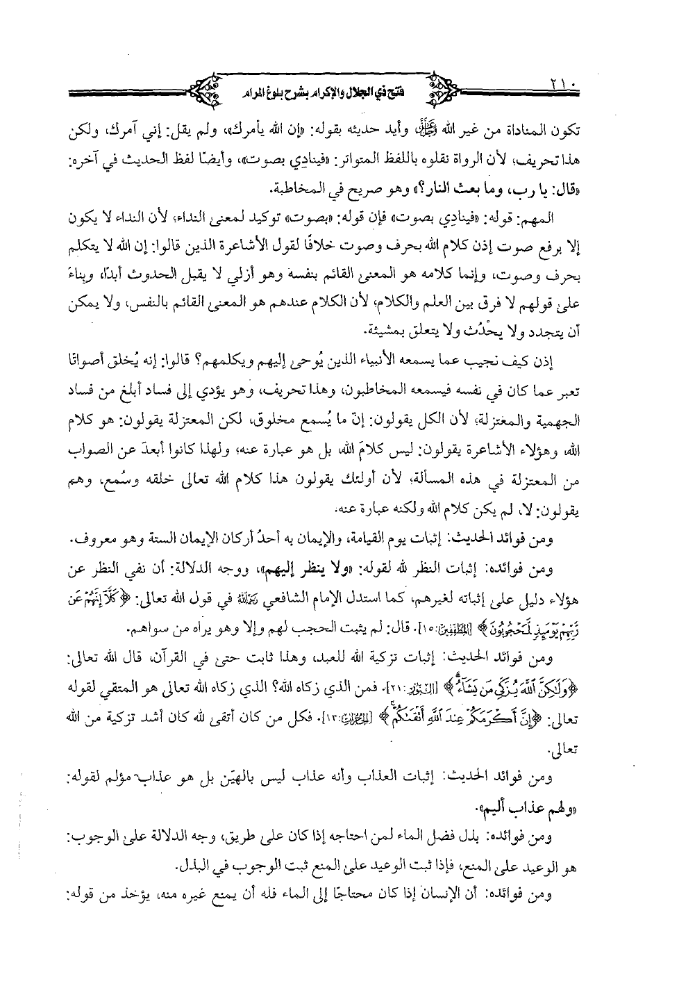 المهم: قوله: "فينادي بصوت" فإن قوله: "بصوت" توكيد لمعنى النداء؛ لأن النداء لا يكون إلا برفع صوت إذن كلام الله بحرف وصوت خلافا لقول الأشاعرة الذين قالوا: إن الله لا يتكلم بحرف وصوت، وإنما كلامه هو المعنى القائم بنفسه وهو أزلي لا يقبل الحدوث أبدا، وبناء على قولهم لا فرق بين العلم والكلام، لأن الكلام عندهم هو المغنى القائم بالنفس، ولا يمكن أن يتجدد ولا يحدث ولا يتعلق بمشيئة.