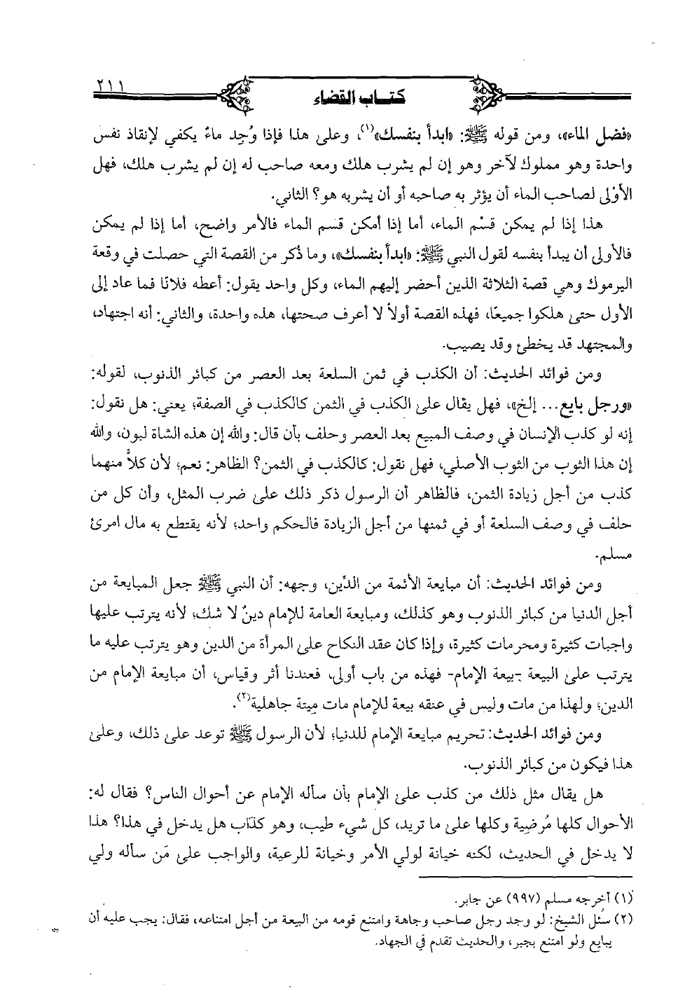"فضل الماء"، ومن قوله صلى الله عليه وسلم: «ابدأ بنفسك»، وعلى هذا فإذا وجد ماء يكفي لإنقاذ نفس واحدة وهو مملوك لآخر وهو إن لم يشرب هلك ومعه صاحب له إن لم يشرب هلك، فهل الأولى لصاحب الماء أن يؤثر به صاحبه أو أن يشربه هو؟ الثاني.