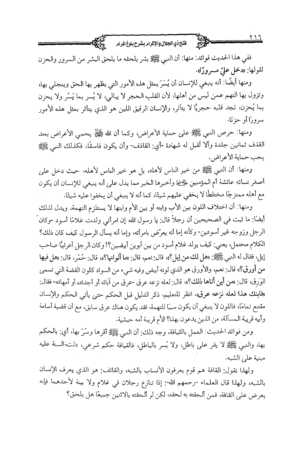 ومنها: أن اختلاف اللون بين الأب وابنه أو بين الأم وابنها لا يستلزم التهمة، ويدل لذلك أيضا: ما ثبت في الصحيحين أن رجلا قال: يا رسول الله، إن امرأتي ولدت غلاما أسود -وكان الرجل وزوجته غير أسودين -وكأنه إما أنه يعرض بامرأته، وإما أنه يسأل الرسول كيف كان ذلك؟ الكلام محتمل، يعني: كيف يولد غلام أسود من بين أبوين أبيضين؟ ! وكان الرجل أعرابيا صاحب إبل، فقال له النبي صلى الله عليه وسلم: «هل لك من إبل»، قال: نعم، قال: «ما ألوانها؟ »، قال: حمر، قال: «هل فيها من أورق؟ » قال: نعم، والأورق هو الذي لونه أبيض وفيه شيء من السواد كلون الفضة التي تسمى الورق، قال: «من أين أتاها ذلك؟ »، قال: لعله نزعه عرق -عرق من آبائه أو أجداده أو أمهاته - فقال: «فابنك هذا لعله نزعه عرق»، انظر للتعليم، ذكر الدليل قبل الحكم حتى يأتي الحكم والإنسان مقتنع تماما، فاللون لا ينبغي أن يكون سببا للتهمة، فقد يكون هناك عرق سابق، مع أن قضية أسامة وأبيه قريبة المسألة، من الذين يدعون بهذا؟ الأم قريبة أمه حبشية.