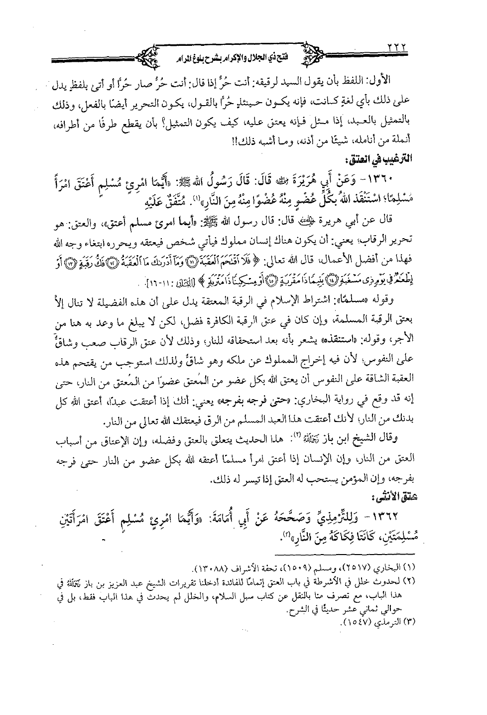 قال عن أبي هريرة (رضي الله عنه) قال: قال رسول الله (صلى الله عليه وسلم): «أيما امرئ مسلم أعتق»، والعتق: هو تحرير الرقاب؛ يعني: أن يكون هناك إنسان مملوك فيأتي شخص فيعتقه ويحرره ابتغاء وجه الله فهذا من أفضل الأعمال، قال الله تعالى: {فَلَا اقتَحَمَ الْعَقَبَةَ (11) وَمَا أَدْرَاكَ مَا الْعَقَبَةُ (12) فَكُّ رَقبَةٍ (13) أَوْ إِطْعَامٌ فِي يومٍ ذِي مَسْغَبَةٍ (14) يَتِيمًا ذَا مَقْرَبَةٍ (15) أَوْ مِسْكِينًا ذَا مَترَبَةٍ} [البلد: 11 - 16].