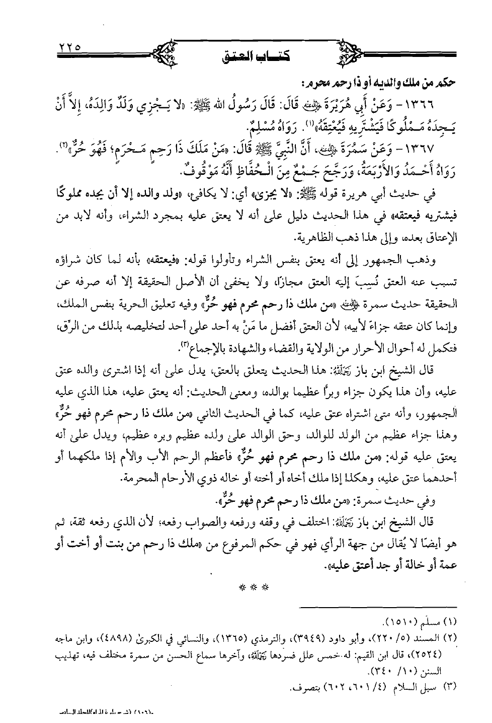 1367 - وعن سَمرة (رضي الله عنه) أن النبي (صلى الله عليه وسلم) قال: «من ملك ذلك رحمٍ مَحْرَمٍ؛ فهو حُر». رواه أحمد والأربعة، ورجح جمع من الحفاظ أنه موقوف.