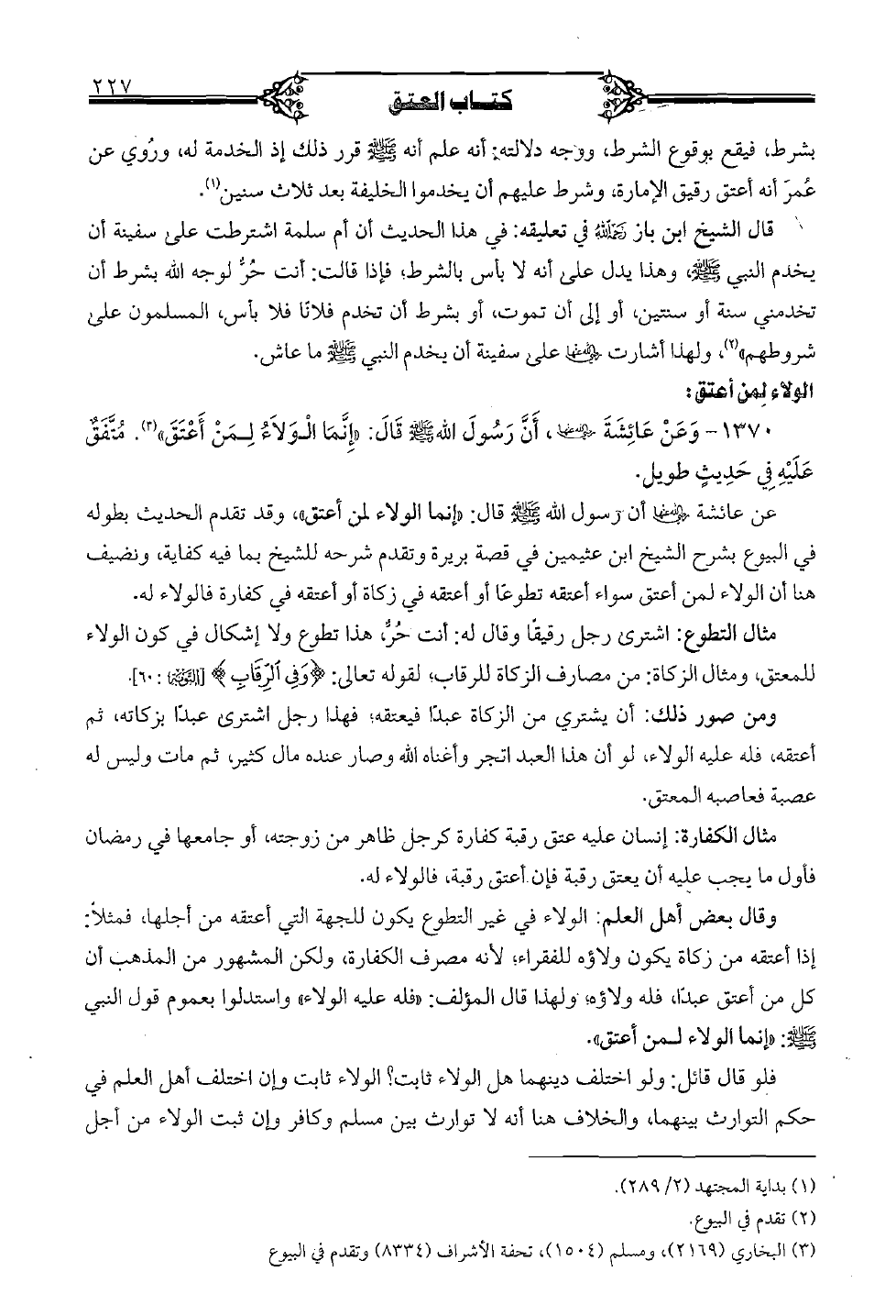(1370) - وعن عائشة (رضي الله عنها)، أن رسول الله (صلى الله عليه وسلم) قال: «إنما الولاء لمن أعتق». متفق عليه في حديث طويل.
