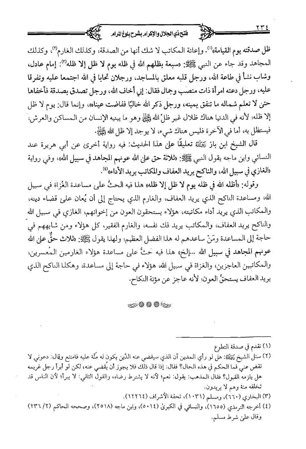 ظل صدقته يوم القيامة». وإعانة المكاتب لا شك أنها من الصدقة، وكذلك الغارم، وكذلك المجاهد وقد جاء عن النبي (صلى الله عليه وسلم): «سبعة يظلهم الله في ظله يوم لا ظل إلا ظله: إمام عادل، وشاب نشأ في طاعة الله، ورجل قلبه معلق بالمساجد، ورجلان تحابا في الله اجتمعا عليه وتفرقا عليه، ورجل دعته امرأة ذات منصب وجمال فقال: إني أخاف الله، ورجل تصدق بصدقة فأخفاها حتى لا تعلم شماله ما تنفق يمينه، ورجل ذكر الله خاليا ففاضت عيناه»، وإنما قال: يوم لا ظل إلا ظله؛ لأنه في الدنيا هناك ظلال غير ظل الله (صلى الله عليه وسلم) وهو ما يبنيه الإنسان من المساكن والعرش، فيستظل به، أما في الآخرة فليس هناك شيء، لا يوجد إلا ظل الله (عز وجل).