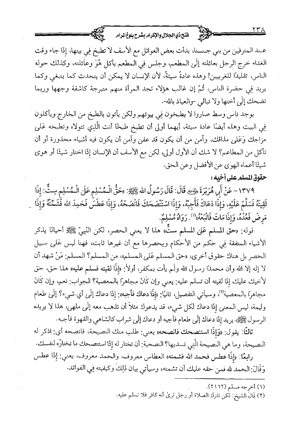 قوله: «حق المسلم على المسلم ستُ» هذا لا يعني الحصر، لكن التي (صلى الله عليه وسلم) أحيانا يذكر الأشياء المتفقة في حكم من الأحكام ويحصرها مع أن غيرها ثابت، فهنا ليس على سبيل الحصر بل هناك حقوق أخرى، «حق المسلم على المسلم»، من المسلم؟ المسلم: مَن شهد أن لا إله إلا الله وأن محمد رسول الله ولم يأت بمكفر، أولاً: «إذا لقيته فسلم عليه» هذا حق، حق لأخيك عليك إذا لقيته أن تسلم عليه: يعني وإن كان مجاهراً بالمعصية؟ الجواب: نعم، وإن كانَ مجاهراً بالمعصية، وسيأتي التفصيل، ثانيا: «إذا دعاك فأجبه»: إذا دعاك إلى أي شيء؟ إلى طعام وليمة، ليس المعنى إذا دعاك لكل شيء، قد يدعوك مثلا أن تذهب معه إلى ملهى، هذا لا يريده الرسول (صلى الله عليه وسلم)، يريد إذا دعاك إلى طعام فأجبه أو دعاك إلى شراب كالشاهي والقهوة فأجبه.