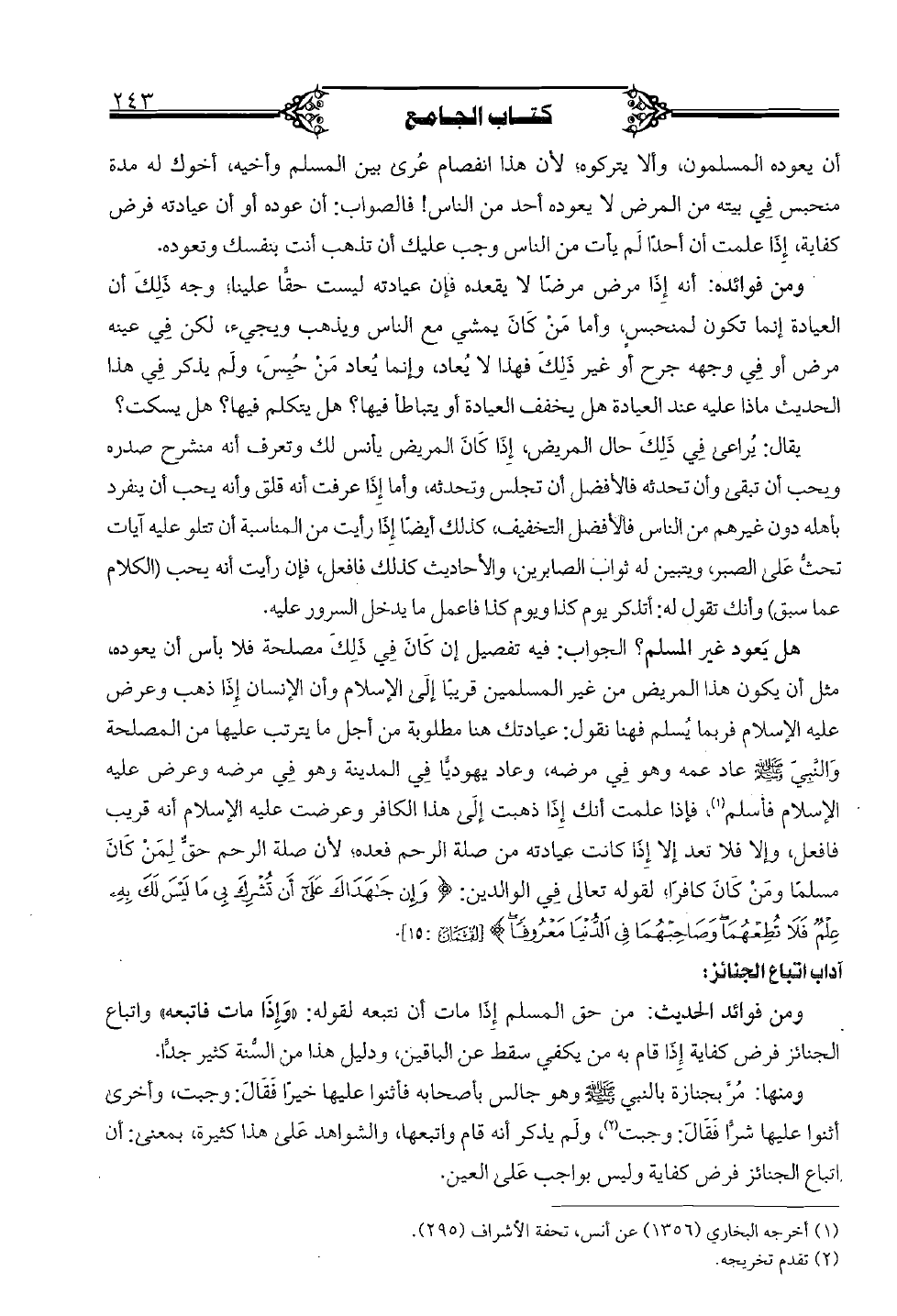 ومنها: مُر بجنازة بالنبى (صلى الله عليه وسلم) وهو جالس بأصحابه فأثنوا عليها خيرا فقال: وجبت، وأخرى أثنوا عليها شرا فقال: وجبت، ولم يذكر أنه قام واتبعها، والشواهد على هذا كثيرة، بمعنى: أن اتباع الجنائز فرض كفاية وليس بواجب على العين.