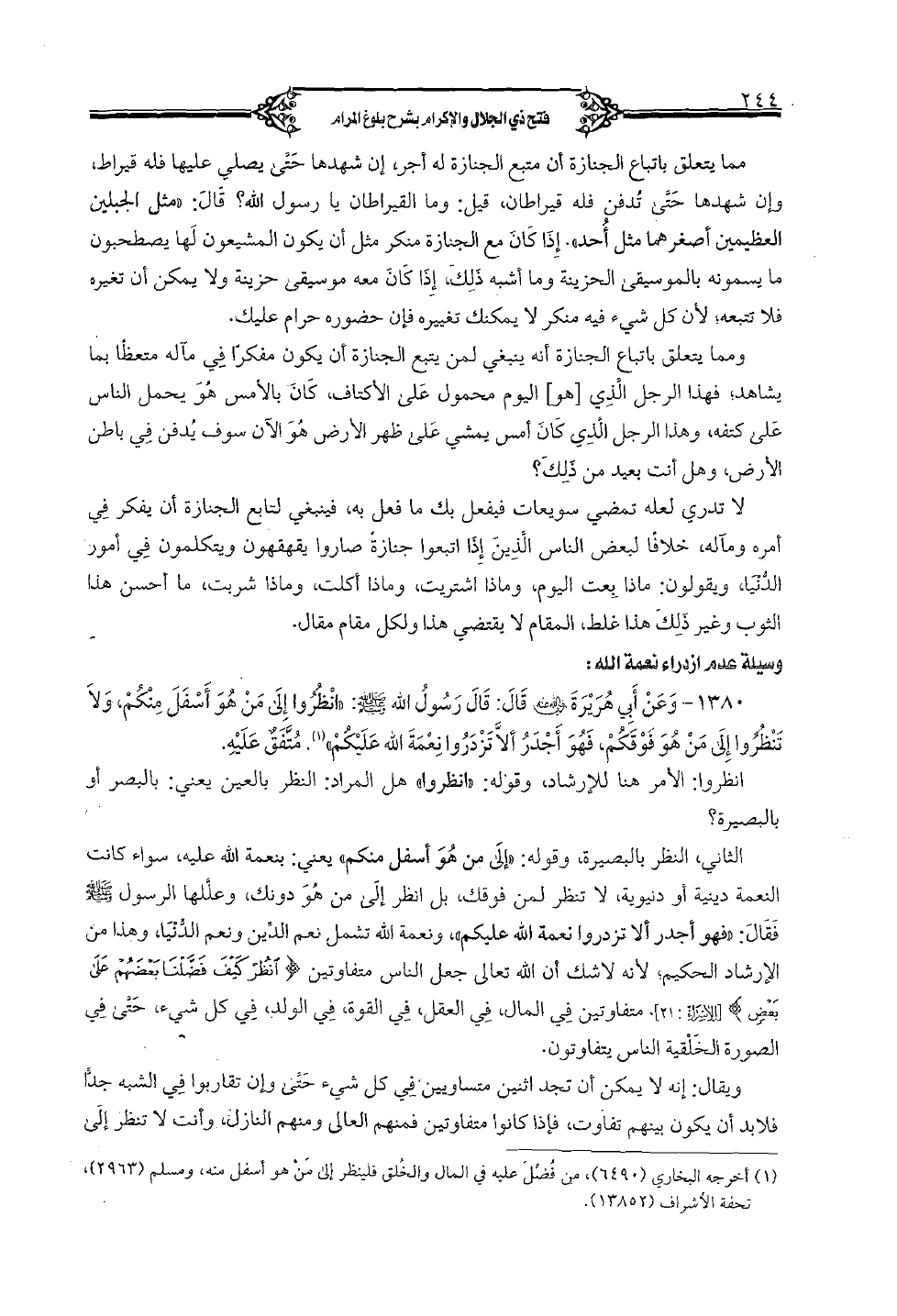 الثاني، النظر بالبصيرة، وقوله «إلى من هو أسفل منكم» يعني: بنعمة الله عليه، سواء كانت النعمة دينية أو دنيوية، لا تنظر لمن فوقك، بل انظر إلى من هو دونك، وعللها الرسول (صلى الله عليه وسلم) فقال: «فهو أجدر ألا تزدروا نعمة الله عليكم»، ونعمة الله تشمل نعم الدين ونعم الدنيا، وهذا من الإرشاد الحكيم؛ لأنه لاشك أن الله تعالى جعل الناس متفاوتين {انظُرْ كَيْفَ فَضَّلْنَا بعْضَهُمْ عَلَى بعْضٍ} [الإسراء: 21]. متفاوتين في المال، في العقل، في القوة، في الولد، في كل شيء، حتّى في الصورة الخلقية الناس يتفاوتون.