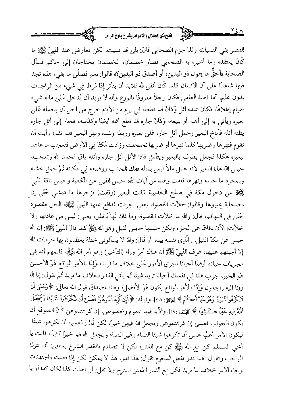 القصر بقي النسيان، ولذا جزم الصحابي قال: بلى قد نسيت، لكن تعارض عند النيي (صلى الله عليه وسلم) ما كان يعتقده وما أخبره به الصحابي فصار خصمان، الخصمان يحتاجان إلى حاكم فسأل الصحابة «أحقّ ما يقول ذو اليدين، أو أصدق ذو اليدين؟ » قالوا: نعم فصلى ما بقي، هذه تجد فيها شاهدا على أن الإنسان كلما كان أتقى لله فلابد أن يتأثر إذا فرط في شيء من الواجبات بدون علم، أما قصة العامي فكان رجلاً معروفا بالورع وأنه لا يريد أن يُدخل على ماله شيء حرام إطلاقا، فكان عنده أثل وكان قد قطعه، في يوم من الأيام خرج من أجل أن يحمله على بعيره ويأتي به إلى أهله أو يبيعه، وكان جاره قد قطع أثاله أيضا وكدسه، فجاء إلى أثل جاره يظنه أثله فأناخ البعير وحمل أثل جاره على بعيره وربطه وشده ونهر البعير فلم تقم، وأبت أن تقوم فنهرها وضربها كلما نهرها أو ضربها تحلحلت وزادت مُكثا في الأرض فتعجب ما عاهد ببعيره هكذا فجعل يطوف بالبعير ويتأمل فإذا الأثل أثل جاره وأثله باق فحمد الله وتعجب، حبس الله هذا البعير لأنه حمل مالاً ليس بماله ففك الخشب ووضعه في مكانه ثم حمل خشبه وبمجرد ما حمله ونهرها قامت وهذه من آيات الله، حبس الفيل عن الكعبة وحبس ناقة النيي (صلى الله عليه وسلم) عن دخول مكة في صلح الحُديبية كانت البعير (وقفت) يزجرها ما تمشي حَتَّى إن الصحابة عيروها وقالوا: خلأت القصواء يعني: جرنت فدافع عنها النبي (صلى الله عليه وسلم) الحق مقصود حَتّى في البهائم، قال: والله ما خلأت القصواء وما ذاك لها بخلق، يعني: ليس من عادتها ولا خلأت؛ الآن دفاعا عن الحق، ولكن حبسها حابس الفيل وهو الله (عز وجل) كما قال النبي (صلى الله عليه وسلم): إن الله حبس عن مكة الفيل، والذي نفسه بيده أو قال: والله لا يسألوني خطة يعظمون بها حرمات الله إلا أجبتهم عليها، عرف النبي (صلى الله عليه وسلم) أن هناك أمرا وراء (التأخير) وهو أمر الله (عز وجل)، فالمهم أننا في مجريات حياتنا أيضا أحيانا تجري الأمور على خلاف ما نريد، وإذا بالأمر الواقع هو الأحسن هو الخير، جرب هذا في نفسك أحيانا تريد شيئا ثم يأتي القدر بخلاف ما تريد ثم تقول: إنا لله وإنا إليه راجعون وإذا بالأمر الواقع يكون هُوَ الأفضل، وهذا مصداق قول الله تعالى: {وَعَسَى أَنْ تَكْرَهُوا شَيْئًا وَهُوَ خَيرٌ لَكُمْ} [البقرة: 216]. وقوله: {فَإِنْ كَرِهْتُمُوهُنَّ فعَسَى أَنْ تَكْرَهُوا شَيْئًا وَيَجْعَلَ اللَّهُ فِيهِ خَيرًا كَثِيرًا} [النساء: 19]. والآية فيها عموم وخصوص، إن كرهتموهن كان المتوقع أن يكون الجواب فعسى إن كرهتموهن ويجعل الله فيهن خيرا، لكن قال: فعسى أن تكرهوا شيئا ليكون الأمر أعلم، عسى أن تكرهوا شيئا النساء وغير النساء ويجعل الله فيه خيرًا كثيرًا فأنت يا أخي المسلم كن مع الله (عز وجل) كن مع القدر، لكن لا تصادم بالقدر الشرع بمعنى: أن تترك الواجب وتقول: هذا قدر تفعل المحرم تقول: هذا قدر، هذا لا يمكن لكن إذا فعلت واجتهدت وجاء الأمر خلاف ما تريد فكن مع القدر اطمئن استرح ولا تقل: لو فعلت كذا لكان كذا أو يا