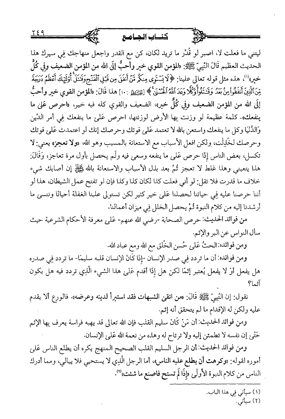 ليتني ما فعلت لا، أصبر لو قُدر ما تريد لكان، كن مع القدر واجعل منهاجك في سيرك هذا الحديث العظيم قال النيي (صلى الله عليه وسلم): «المؤمن القوي خير وأحب إلى الله من المؤمن الضعيف وفي كل خير»، هذه مثل قوله تعالى علينا: {لَا يَسْتَوِي مِنكُم مَّنْ أَنفَقَ مِن قبْلِ الْفَتْحِ وَقَاتَلَ أولئك أَعْظَمُ دَرَجَةً مِّنَ الَّذِينَ أَنفَقُوا مِن بعْدُ وَقَاتلُوا وَكُلًّا وَعَدَ اللَّهُ الْحُسْنَى} [الحديد: 10]. هذا قال: «المؤمن القوي خير وأحبُ إلى الله من المؤمن الضعيف وفي كل خير» الضعيف والقوي كله فيه خير «احرص على ما ينفعك». كلمة عظيمة لو وزنت بها الأرض لوزنتها، احرص على ما ينفعك في أمر الدين وَالدُّنيا وكل ما ينفعك واستعن بالله لا تعتمد على قوتك وحرصك إنك لو اعتمدت على قوتك وحرصك لخُذلت، ولكن أفعل الأسباب مع الاستعانة بالمسبب وهو الله، «ولا تعجز» يعني: لا تكسل، بعض الناس إذا حرص على ما ينفعه وسعى فيه ولم يحصل بأول مرة تعاجز، وقال: هذا يتعبني وهذا غلط لا تعجز ثمّ بعد بذل الأسباب والاستعانة بالله (عز وجل) إن أصابك شيء خلاف ما قدرت فلا تقل: لو أني فعلت كذا لكان كذا وكذا فإن لو تفتح عمل الشيطان، هذا لو أننا حرصنا عليه في حياتنا لحصلنا على خير كثير لكن تستولى علينا الغفلة أحيانا وتنسى ما أرشدنا إليه من كلام النبوة ثم يحصل الخلل في ميزان أعمالنا.