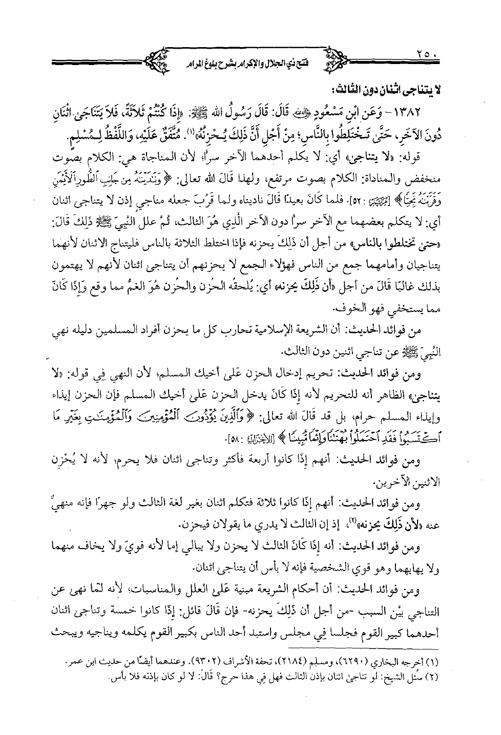 1382 - وعن ابن مسعود (رضي الله عنه) قال: قال رسول الله (صلى الله عليه وسلم): «إذا كنتم ثلاثة، فلا يتناجى اثنان دون الآخر، حتى تختلطوا بالناس؛ من أجل أن ذلك يحزنه». متفق عليه، واللفظ لمسلم.