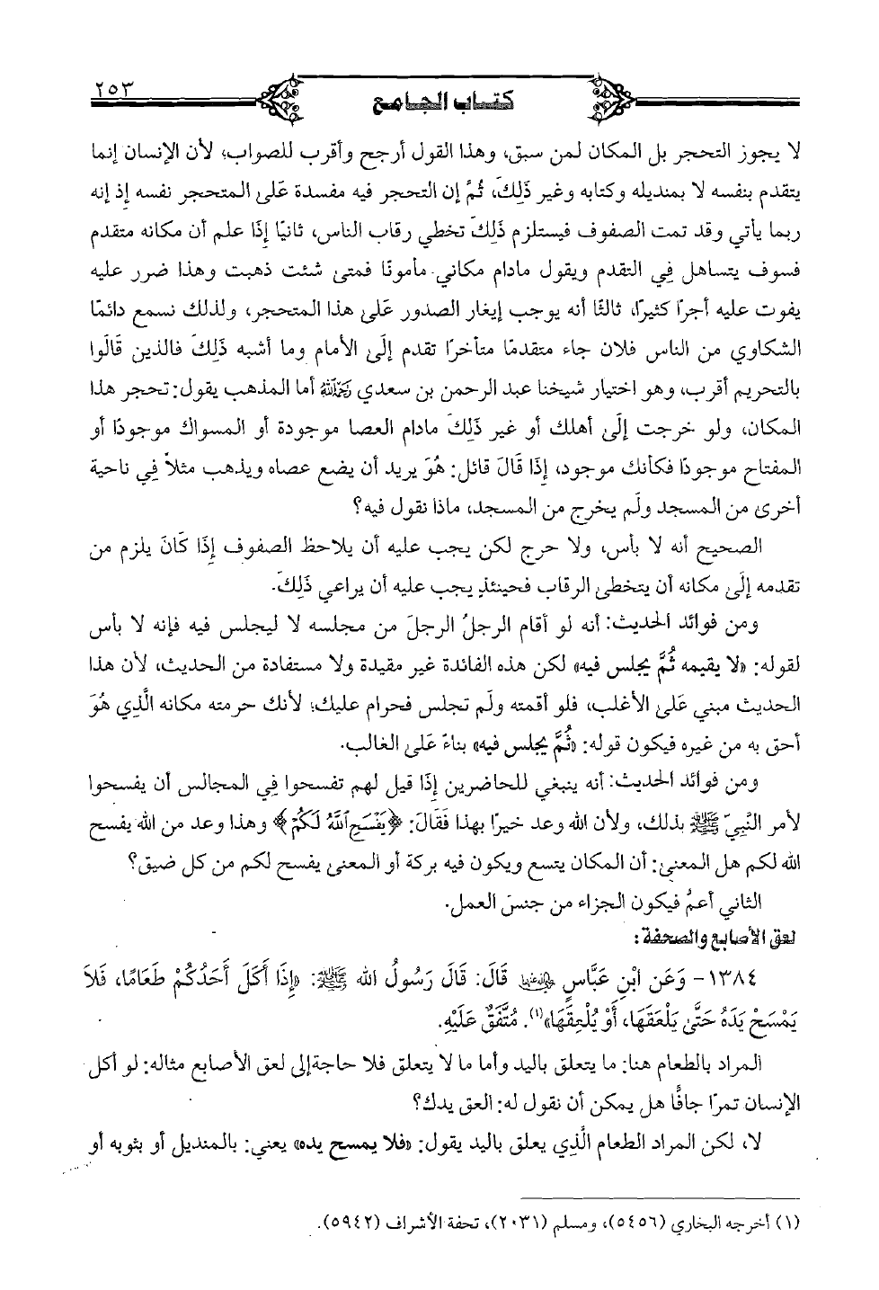 1384 - وعن ابن عباس رضي الله عنه قال: قال رسول الله صلى الله عليه وسلم: «إذا أكل أحدكم طعامًا، فلا يمسح يده حتى يلعقها، أو يلعقها». متفق عليه.