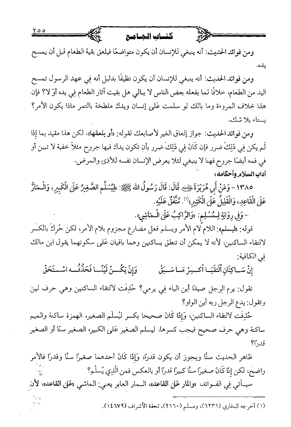1385 - وعن أبي هريرة رضي الله عنه قال: قال رسول الله صلى الله عليه وسلم: «ليسلم الصغير على الكبير، والمار على القاعد، والقليل على الكثير». متفق عليه.