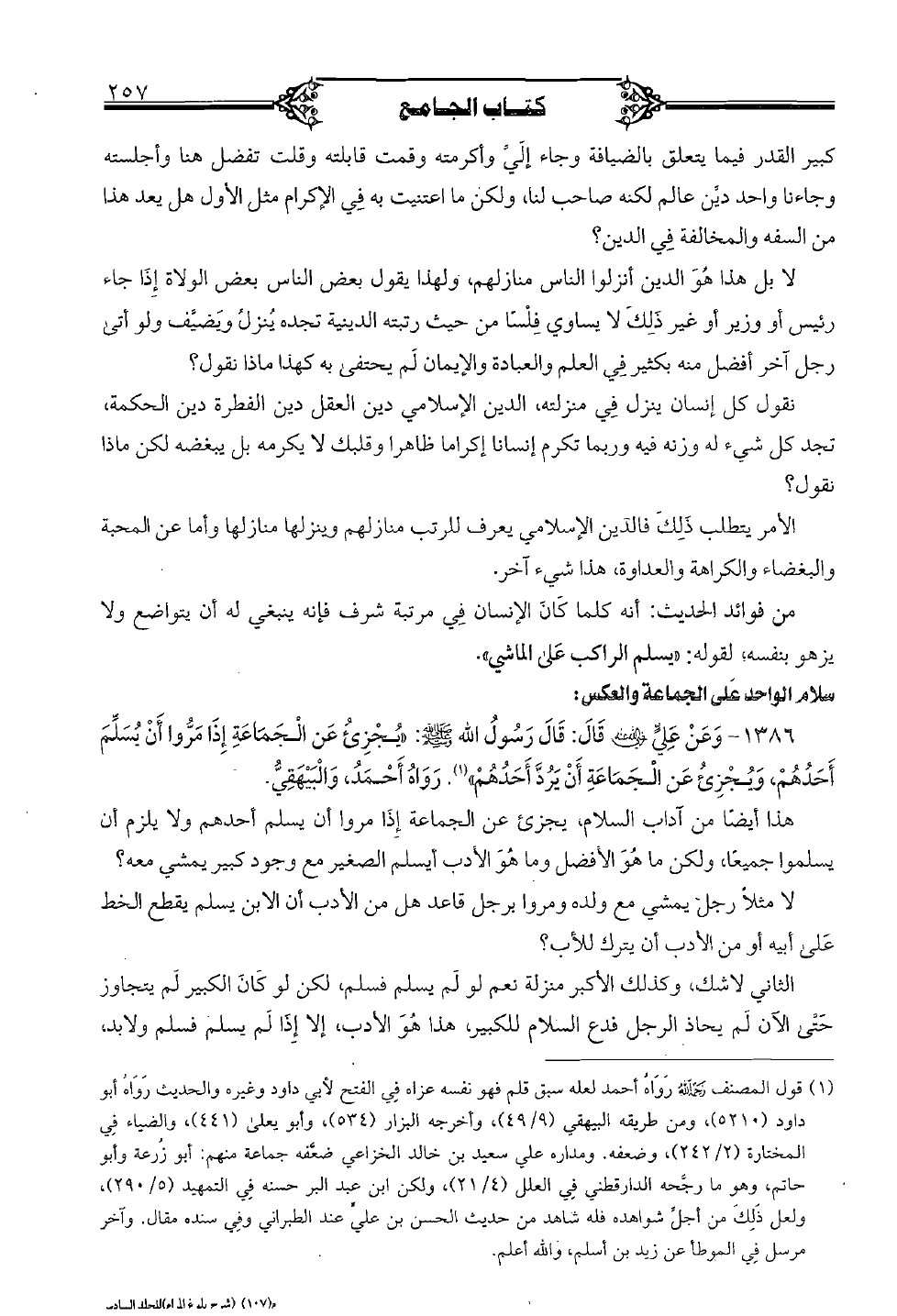 هذا أيضًا من آداب السلام، يجزئ عن الجماعة إذا مروا أن يسلم أحدهم ولا يلزم أن يسلموا جميعًا، ولكن ما هو الأفضل وما هو الأدب أيسلم الصغير مع وجود كبير يمشي معه؟
