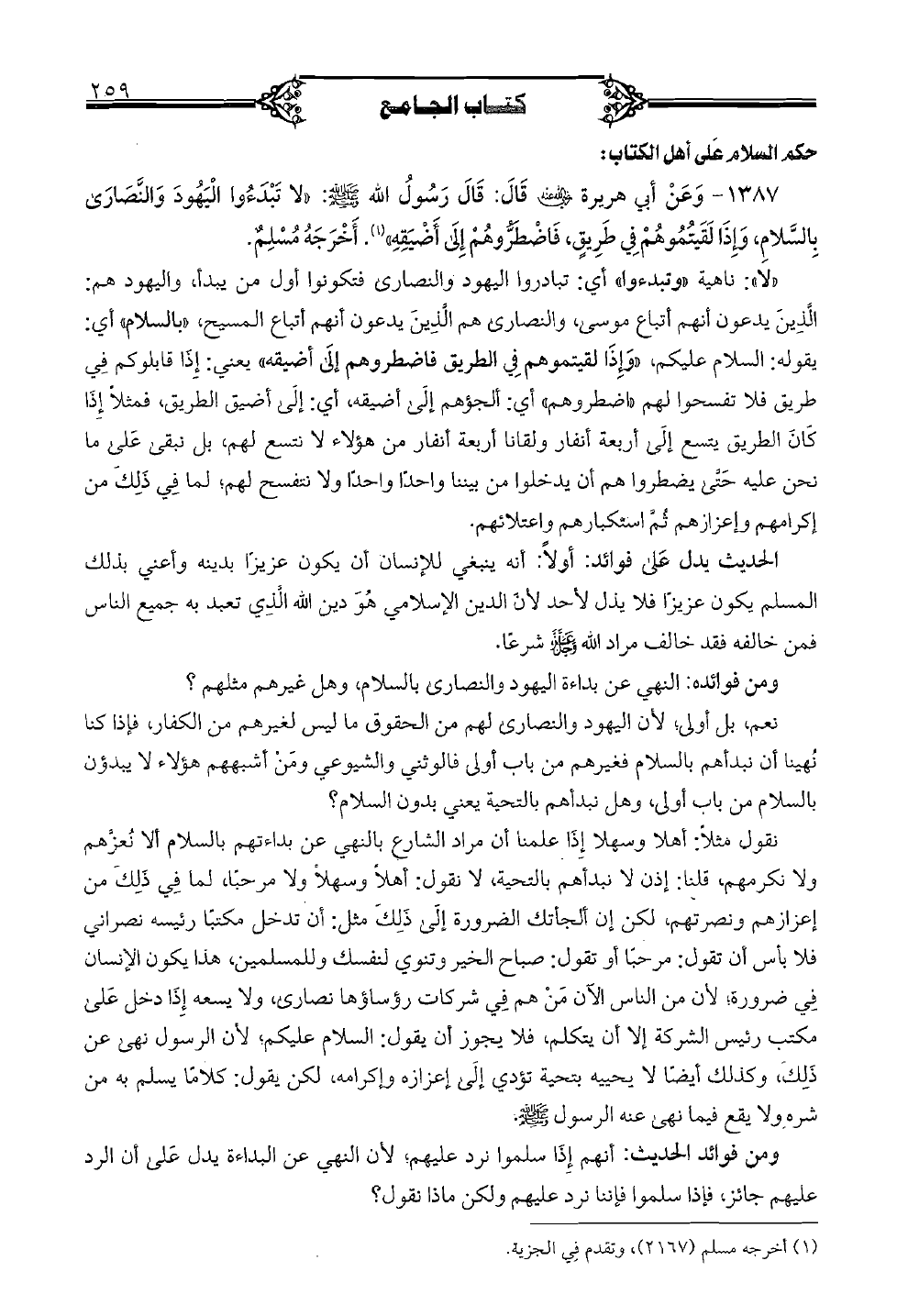 «لا»: ناهية "وتبدءوا" أي: تبادروا اليهود والنصارى فتكونوا أول من يبدأ، واليهود هم: الذين يدعون أنهم أتباع موسى، والنصارى هم الذين يدعون أنهم أتباع المسيح، "بالسلام" أي: يقوله: السلام عليكم، «وإذا لقيتموهم في الطريق فاضطروهم إلى أضيقه» يعني: إذا قابلوكم في طريق فلا تفسحوا لهم "اضطروهم" أي: ألجؤهم إلى أضيقه، أي: إلى أضيق الطريق، فمثلاً كان الطريق يتسع إلى أربعة أنفار ولقانا أربعة أنفار من هؤلاء لا نتسع لهم، بل نبقى على ما نحن عليه حتى يضطروا هم أن يدخلوا من بيننا واحدًا واحدًا ولا نتفسح لهم؛ لما في ذلك من إكرامهم وإعزازهم ثم استكبارهم واعتلائهم.