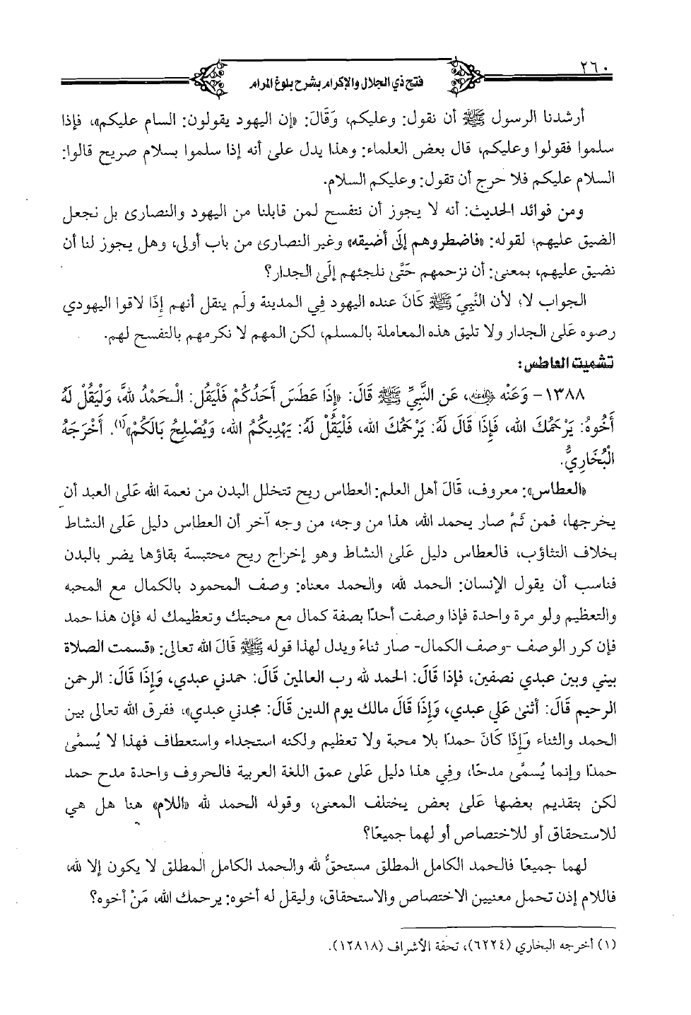 "العطاس": معروف، قال أهل العلم: العطاس ريح تتخلل البدن من نعمة الله على العبد أن يخرجها، فمن ثم صار يحمد الله هذا من وجه، من وجه آخر أن العطاس دليل على النشاط بخلاف التثاؤب، فالعطاس دليل على النشاط وهو إخراج ريح محتبسة بقاؤها يضر بالبدن فناسب أن يقول الإنسان: الحمد لله والحمد معناه: وصف المحمود بالكمال مع المحبة والتعظيم ولو مرة واحدة فإذا وصفت أحدًا بصفة كمال مع محبتك وتعظيمك له فإن هذا حمد فإن كرر الصوف - وصف الكمال - صار ثناء وبدل لهذا قوله صلى الله عليه وسلم قال الله تعالى: «قسمت الصلاة بيني وبين عبدي نصفين، فإذا قال: الحمد لله رب العالمين قال: حمدني عبدي، وإذا قال: الرحمن الرحيم قال: أثنى علي عبدي، وإذا قال مالك يوم الدين قال: مجدني عبدي»، ففرق الله تعالى بين الحمد والثناء وإذا كان حمدًا بلا محبة ولا تعظيم ولكنه استجداء واستعطاف فهذا لا يسمى حمدًا وإنما يسمى مدحًا، وفي هذا دليل على عمق اللغة العربية فالحروف واحدة مدح حمد لكن بتقديم بعضها على بعض يختلف المعنى، وقوله الحمد لله "اللام" هنا هل هي للاستحقاق أو للاختصاص أو لهما جميعًا؟