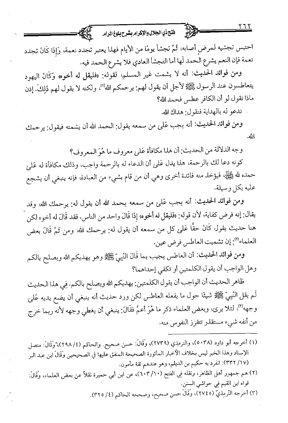 كونه دعا لك بالرحمة، هذا يدل على أن الدعاء له بالرحمة واجب، وذلك مكافأة له على حمده لله عز وجل، فيؤخذ منه فائدة أخرى وهي أن من قام بشيء من العبادة، فإنه ينبغي أن يشجع عليه بكل وسيلة.