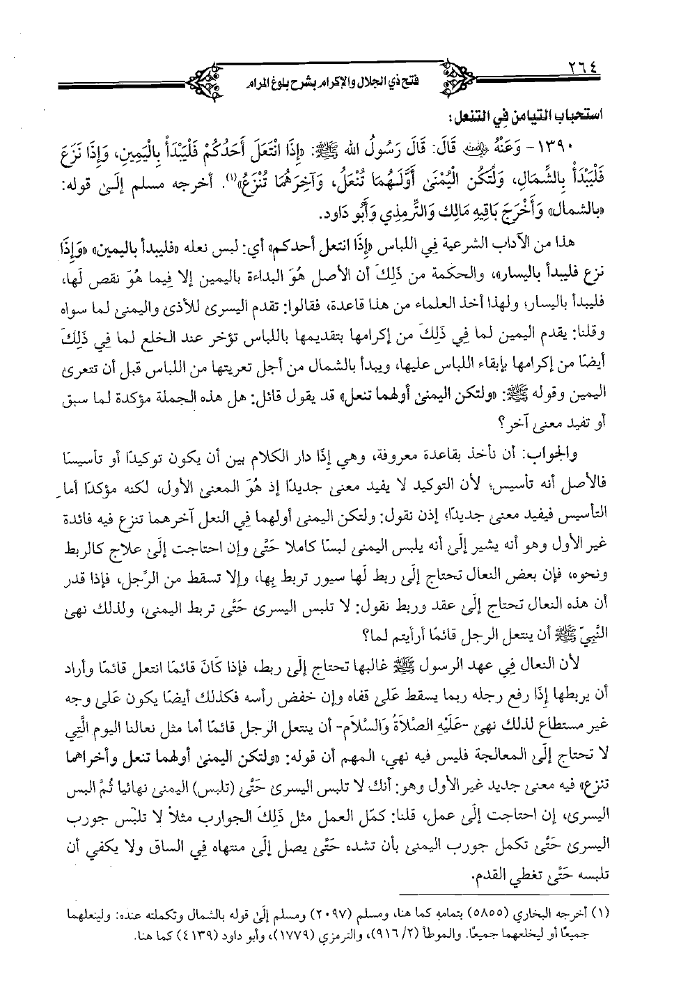 1390 - وعنه رضي الله عنه قال: قال رسول الله صلى الله عليه وسلم: «إذا انتعل أحدكم فليبدأ باليمين، وإذا نزع فليبدأ بالشمال، ولتكن اليمنى أولهما تنعل، وآخرهما تنزع». أخرجه مسلم إلى قوله: «بالشمال» وأخرج باقيه مالك والترمذي وأبو داود.