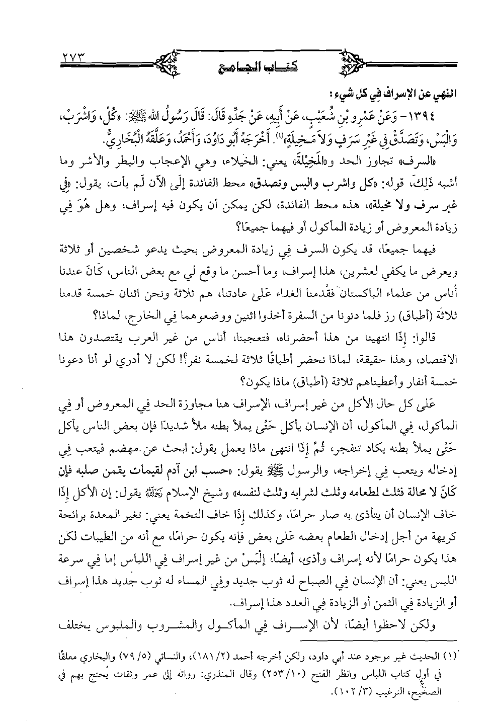1394 - وعن عمر بن شعيب، عن أبيه، عن جده قال: قال رسول الله صلى الله عليه وسلم: «كل، واشرب، والبس، وتصدق في غير سرفٍ ولا مخيلةٍ». أخرجه أبو داود، وأحمد، وعقله البخاري.