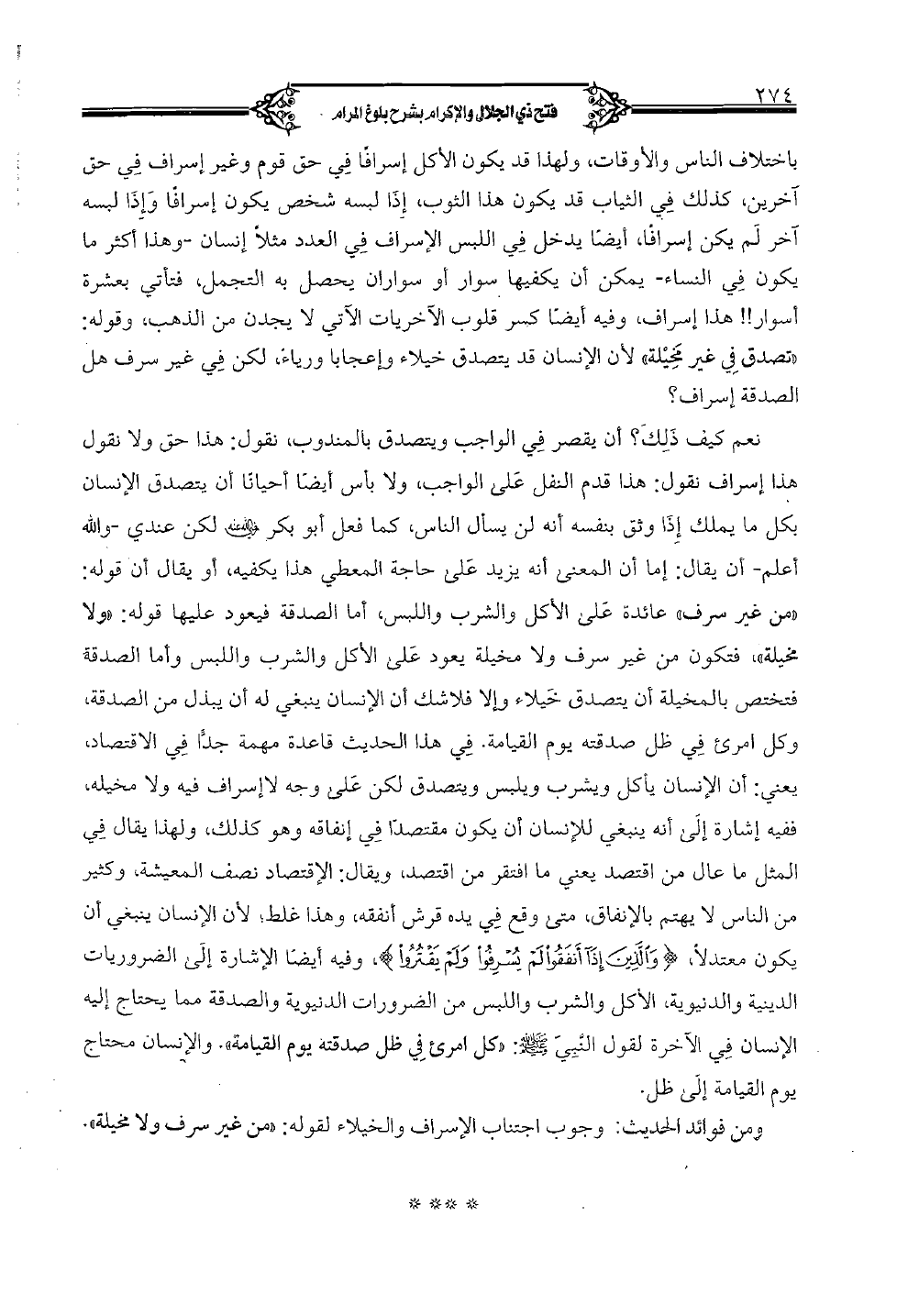 نعم كيف ذلك؟ أن يقصر في الواجب ويتصدق بالمندوب، نقول: هذا حق ولا نقول هذا إسراف نقول: هذا قدم النفل على الواجب، ولا بأس أيضًا أحيانًا أن يتصدق الإنسان بكل ما يملك إذا وثق بنفسه أنه لن يسأل الناس، كما فعل أبو بكر رضي الله عنه لكن عندي - والله أعلم - أن يقال: إما أن المعنى أنه يزيد على حاجة المعطي هذا يكفيه، أو يقال أن قوله: "من غير سرف" عائدة على الأكل والشرب واللبس، أما الصدقة فيعود عليها قوله: "ولا مخيلة"، فتكون من غير سرف ولا مخيلة يعود على الأكل والشرب واللبس وأما الصدقة فتختص بالمخيلة أن يتصدق خيلاء وإلا فلاشك أن الإنسان ينبغي له أن يبذل من الصدقة، وكل امرئ في ظل صدقته يوم القيامة. في هذا الحديث قاعدة مهمة جدًا في الاقتصاد، يعني: أن الإنسان يأكل ويشرب ويلبس ويتصدق لكن على وجه لا إسراف فيه ولا مخيله، ففيه إشارة إلى أنه ينبغي للإنسان أن يكون مقتصدًا في إنفاقه وهو كذلك، ولهذا يقال في المثل ما عال من اقتصد يعني ما افتقر من اقتصد، ويقال: الاقتصاد نصف المعيشة، وكثير من الناس لا يهتم بالإنفاق، متى وقع في يده قرش أنفقه، وهذا غلط؛ لأن الإنسان ينبغي أن يكون معتدلاً، {والذين إذا أنفقوا لم يسرفوا ولم يفتروا}، وفيه أيضًا الإشارة إلى الضروريات الدينية والدنيوية، الأكل والشرب واللبس من الضرورات الدنيوية والصدقة مما يحتاج إليه الإنسان في الآخرة لقول النبي صلى الله عليه وسلم: «كل امرئ في ظل صدقته يوم القيامة». والإنسان محتاج يوم القيامة إلى ظل.