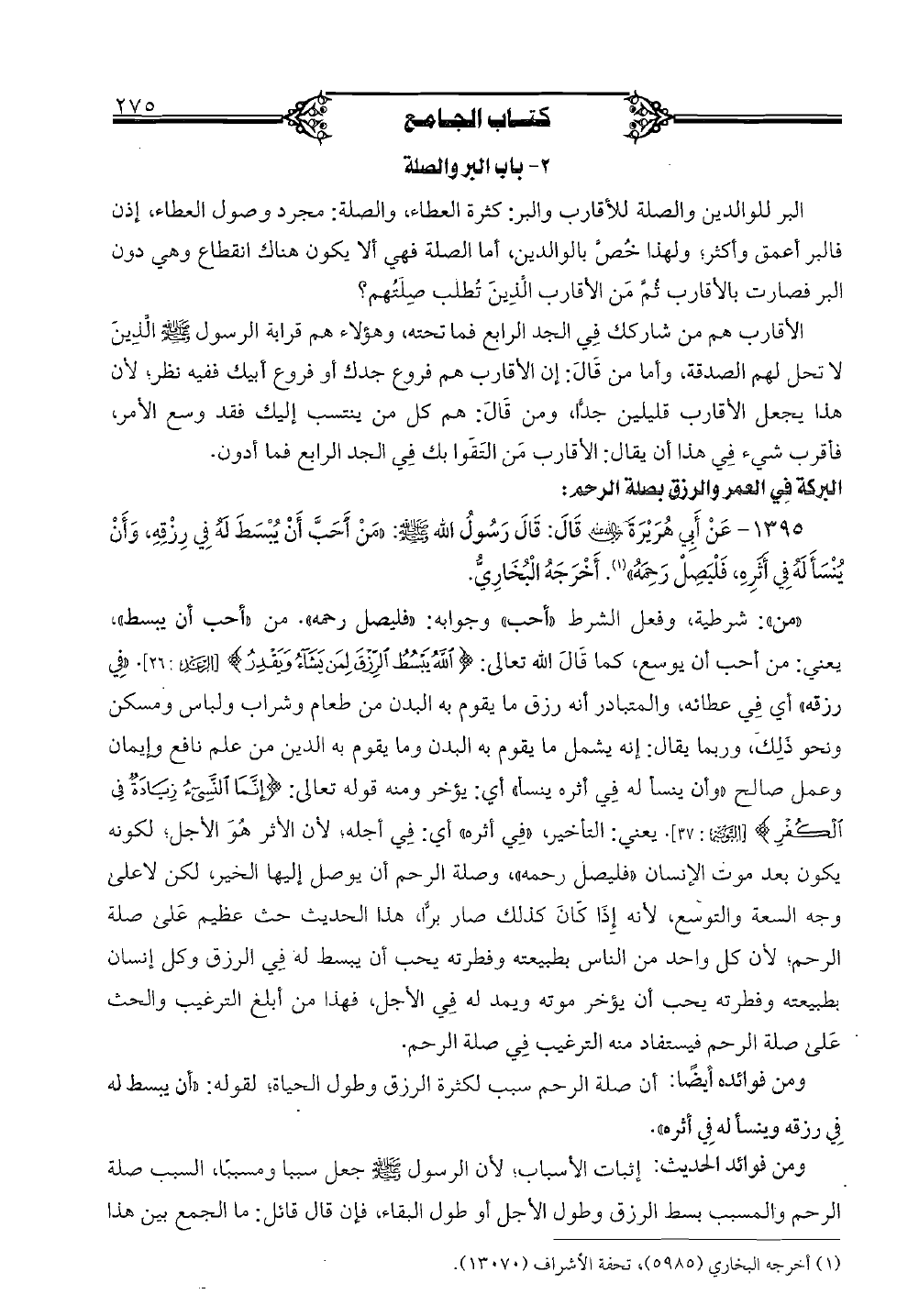 1395 - عن أبي هريرة رضي الله عنه قال: قال رسول الله صلى الله عليه وسلم: «من أحب أن يبسط له في رزقه، وأن ينسأله في أثره، فليصل رحمه». أخرجه البخاري.