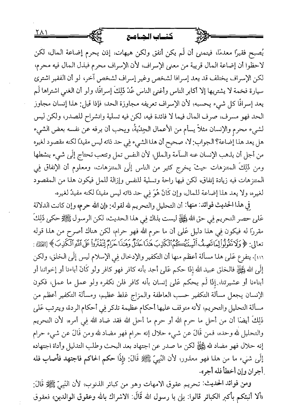 يصبح فقيرًا معدمًا، فيتمنى أن لم يكن أنفق ولكن هيهات، إذن يحرم إضاعة المال، لكن لاحظوا أن إضاعة المال قريبة من معنى الإسراف؛ لأن الإسراف محرم فبذل المال فيه محرم، لكن الإسراف يختلف قد يعد إسرافا لشخص وغير إسراف لشخص آخر، لو أن الفقير اشترى سيارة فخمة لا يشتريها إلا أكابر الناس وأغنى الناس عد ذلك إسرافًا، ولو أن الغني اشتراها لم يعد إسرافًا كل شيء يحسبه؛ لأن الإسراف تعريفه مجاوزة الحد؛ فإذا قيل: هذا إنسان مجاوز الحد فهو مسرف، صرف المال فيما لا فائدة فيه، لكن فيه تسلية وانشراح للصدر، ولكن ليس لشيء محرمٍ والإنسان مثلاً يسأم من الأعمال الجدية، ويحب أن يرفه عن نفسه بعض الشيء هل يعد هذا إضاعة؟ الجواب: لا، صحيح أن هذا الشيء في حد ذاته ليس مقيدًا لكنه مقصود لغيره من أجل أن يذهب الإنسان عنه السآمة والملل؛ لأن النفس تمل وتتعب تحتاج إلى شيء ينشطها ومن ذلك المنتزهات حيث يخرج كثير من الناس إلى المنتزهات، ومعلوم أن الإنفاق في المنتزهات فيه زيادة إنفاق، لكن فيها راحة وتسلية للنفس وإزالة للمل فيكون هذا من المقصود لغيره، ولا يعد هذا إضاعة للمال، وإن كان هو في حد ذاته ليس مفيدًا لكنه مفيد لغيره.