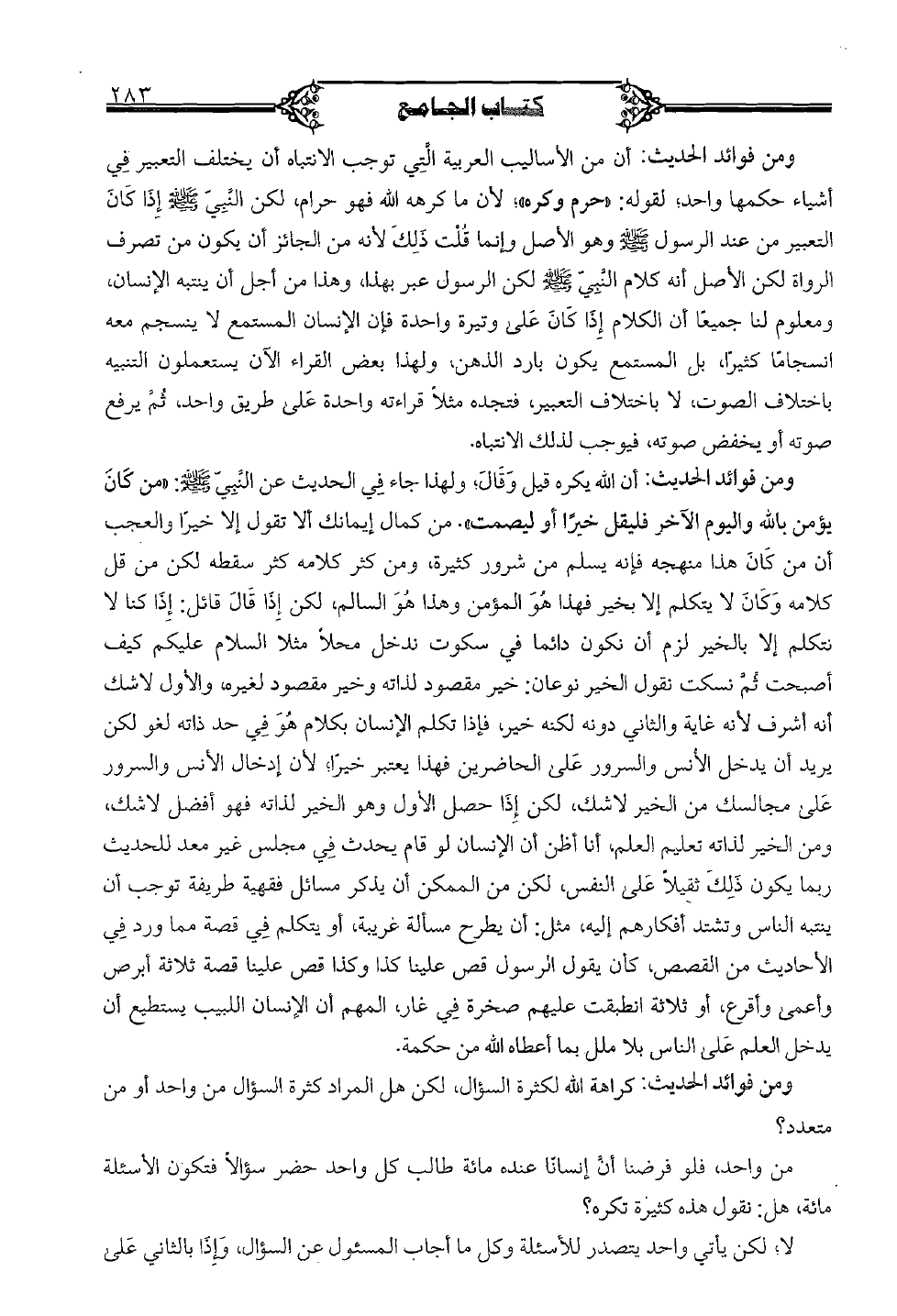 ومن فوائد الحديث: أن الله يكره قيل وقال؛ ولهذا جاء في الحديث عن النبي صلى الله عليه وسلم: «من كان يؤمن بالله واليوم الآخر فليقل خيرًا أو ليصمت». من كمال إيمانك ألا تقول إلا خيرًا والعجب أن من كان هذا منهجه فإنه يسلم من شرور كثيرة، ومن كثر كلامه كثر سقطه لكن من قل كلامه وكان لا يتكلم غلا بخير فهذا هو المؤمن وهذا هو السالم، لكن إذا قال قائل: إذا كنا لا نتكلم إلا بالخير لزم أن نكون دائما في سكوت ندخل محلاً مثلا السلام عليكم كيف أصبحت ثم نسكت نقول الخير نوعان: خير مقصود لذاته وخير مقصود لغيره، والأول لاشك أنه أشرف لأنه غاية والثاني دونه لكنه خير، فإذا تكلم الإنسان بكلام هو في حد ذاته لغو لكن يريد أن يدخل الأنس والسرور على الحاضرين فهذا يعتبر خيرًا؛ لأن إدخال الأنس والسرور على مجالسك من الخير لاشك، لكن إذا حصل الأول وهو الخير لذاته فهو أفضل لاشك، ومن الخير لذاته تعليم العلم، أنا أظن أن الإنسان لو قام يحدث في مجلس غير معد للحديث ربما يكون ذلك ثقيلاً على النفس، لكن من الممكن أن يذكر مسائل فقهية طريفة توجب أن ينتبه الناس وتشتد أفكارهم إليه، مثل: أن يطرح مسألة غريبة، أو يتكلم في قصة مما ورد في الأحاديث من القصص، كأن يقول الرسول قص علينا كذا وكذا قص علينا قصة ثلاثة أبرص وأعمى وأقرع، أو ثلاثة انطبقت عليهم صخرة في غار، المهم أن الإنسان اللبيب يستطيع أن يدخل العلم على الناس بلا ملل بما أعطاه الله من حكمة.