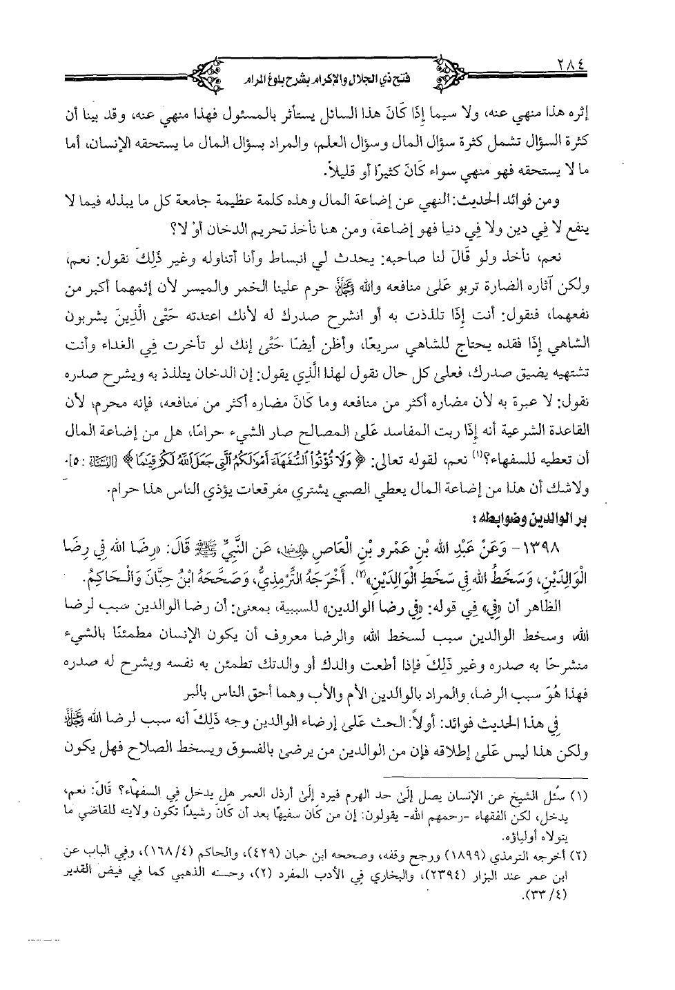 1398 - وعن عبد الله بن عمرو بن العاص رضي الله عنهما، عن النبي صلى الله عليه وسلم قال: «رضا الله في رضا الوالدين، وسخط الله في سخط الوالدين». أخرجه الترمذي، وصححه ابن حبان والحاكم.