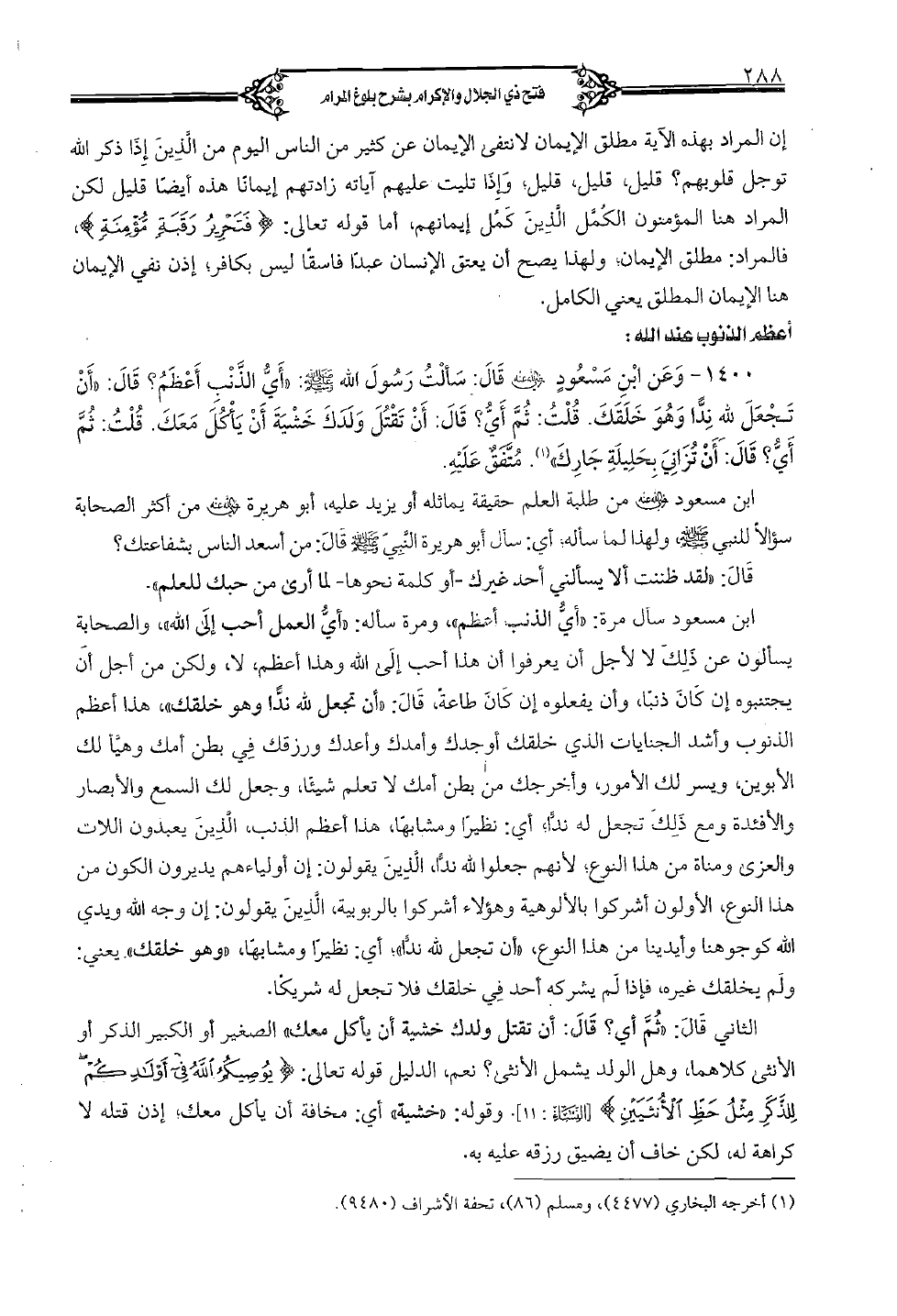1400 - وعن ابن مسعود رضي الله عنه قال: سألت رسول الله صلى الله عليه وسلم: «أي الذنب أعظم؟ قال: "أن تجعل لله ندًا وهو خلقك. قلت: ثم أي؟ قال: أن تقتل ولدك خشية أن يأكل معك. قلت: ثم أي؟ قال: أن تزاني بحليلة جارك». متفق عليه.