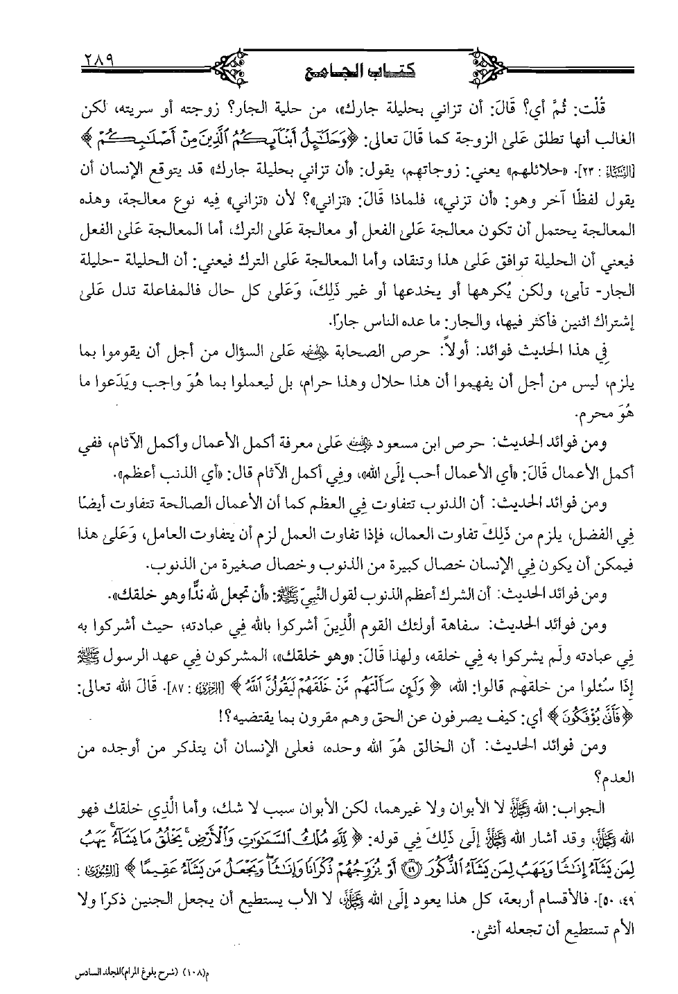 قلت: ثم أي؟ قال: أن تزاني بحليلة جارك"، من حلية الجار؟ زوجته أو سريته، لكن الغالب أنها تطلق على الزوجة كما قال تعالى: {وحلائل أبنائكم الذين من أصلابكم} [النساء: 23]. "حلائلهم" يعني: زوجاتهم، يقول: "أن تزاني بحليلة جارك" قد يتوقع الإنسان أن يقول لفظًا آخر وهو: "أن تزني"، فلماذا قال: "تزاني"؟ لأن "تزاني" فيه نوع معالجة، وهذه المعالجة يحتمل أن تكون معالجة على الفعل أو معالجة على الترك، أما المعالجة على الفعل فيعني أن الحليلة توافق على هذا وتنقاد، وأما المعالجة على الترك فيعني: أن الحليلة - حليلة الجار - تأبى، ولكن يكرهها أو يخدعها أو غير ذلك، وعلى كل حال فالمفاعلة تدل على اشتراك اثنين فأكثر فيها، والجار: ما عده الناس جارًا.