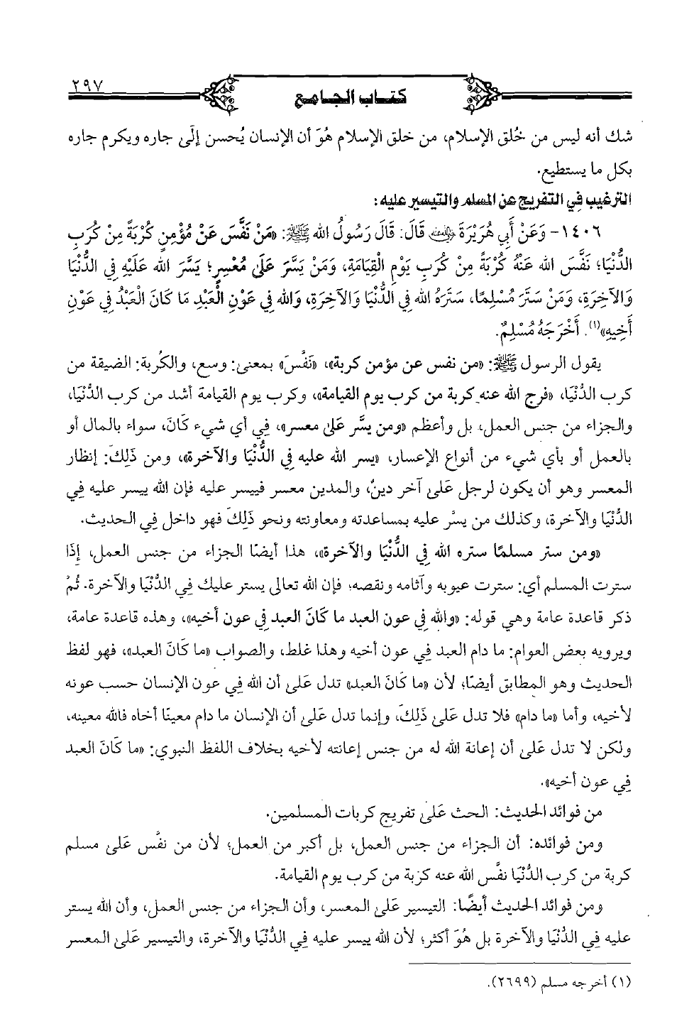 1406 - وعن أبي هريرة رضي الله عنه قال: قال رسول الله صلى الله عليه وسلم: «من نفس عن مؤمن كربةً من كرب الدنيا؛ نفس الله عنه كربةً من كرب يوم القيامة، ومن يسر على معسر؛ يسر الله عليه في الدنيا والآخرة، ومن ستر مسلمًا، ستره الله في الدنيا والآخرة، والله في عون العبد ما كان العبد في عون أخيه». أخرجه مسلم.