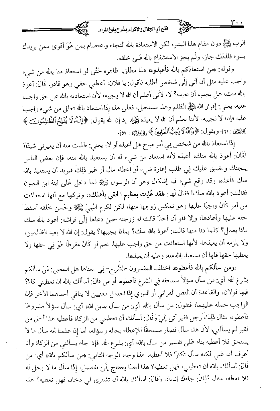 وقوله: "من استعاذكم بالله فأعيذوه" هذا مطلق، ظاهره حتى لو استعاذ منا بالله من شيء واجب عليه مثل أن آتي إلى شخص أطلبه فأقول: يا فلان، أعطني حقي وهو قادر، قال: أعوذ بالله من: هل يجب أن نعيذه؟ لا؛ لأني أعلم أن الله لا يجيبه؛ لأن استعاذته بالله عن حق واجب عليه، يعني: إقرار الله عز وجل الظلم وهذا مستحيل، فعلى هذا إذا استعاذ بالله تعالى من شيء واجب عليه فإننا لا نجيبه؛ لأننا نعلم أن الله لا يعيذه عز وجل، إذ إن الله يقول: {إنه لا يفلح الظالمون} [الأنعام: 21]. ويقول: {والله لا يحب الظالمين} [آل عمران: 57].
