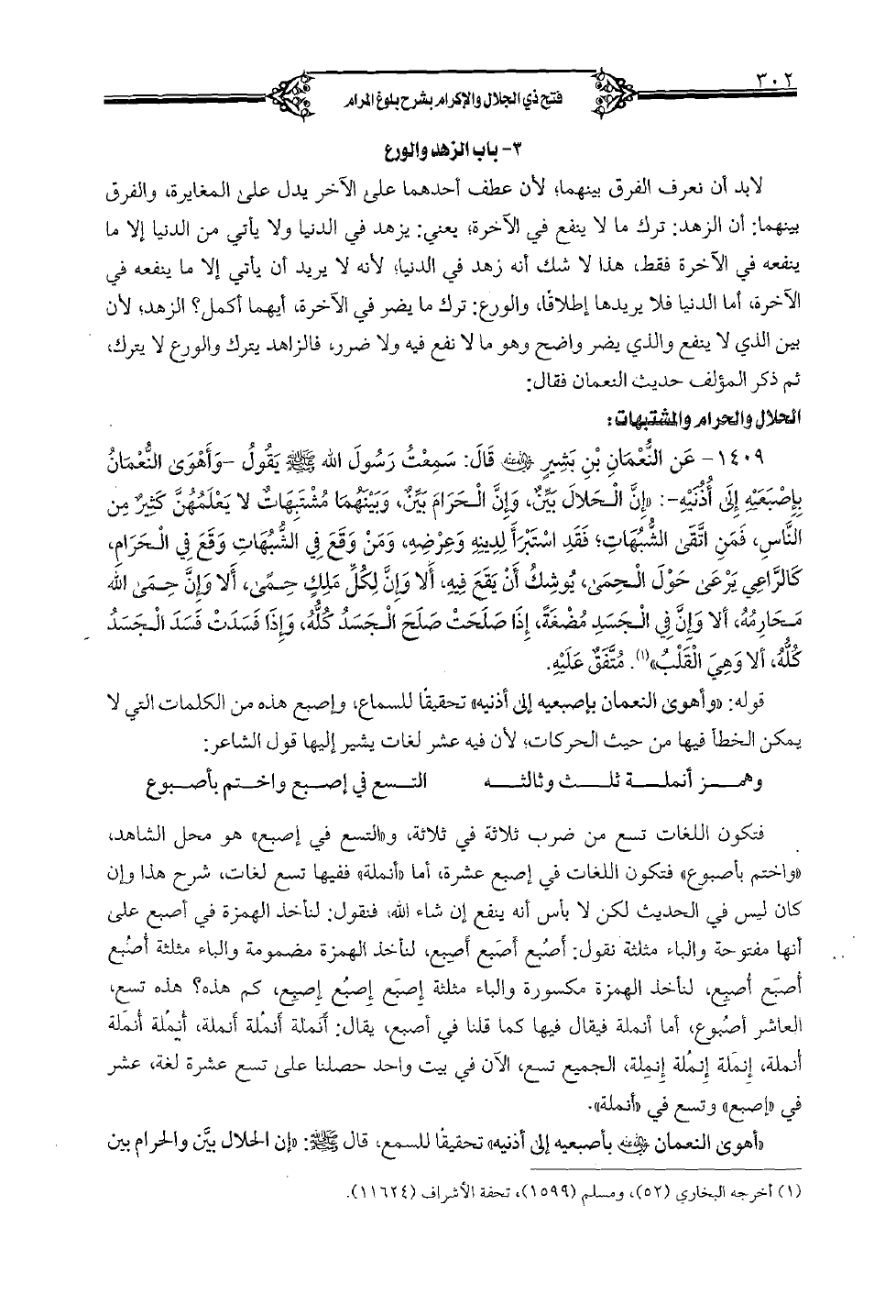 1409 - عن النعمان بن بشير (رضي الله عنه) قال: سمعت رسول الله (صلى الله عليه وسلم) يقول -وأهوى النعمان بإصبعيه إلى أذنيه: «إن الحلال بين، وإن الحرام بَين، وبينهما مشتبهات لا يعلمهن كثير من الناس، فمن اتقى الشبهات؛ فقد استبرأ لدينه وعرضه، ومن وقع في الشبهات وقع في الحرام، كالراعي يرعى حول الحمى، يوشك أن يقع فيه، ألا وإن لكل ملك حمى، ألا وإن حمى الله محارمه، ألا وإن في الجسد مضغة، إذا صلحت صلح الجسد كله، وإذا فسدت فسد الجسد كله، ألا وهي القلب». متفق عليه. قوله: «وأهوى النعمان بإصبعيه إلى أذنيه» تحقيقاً للسماع، وإصبع هذه من الكلمات التي لا يمكن الخطأ فيها من حيث الحركات؛ لان فيه عشر لغات يشير إليها قول الشاعر: