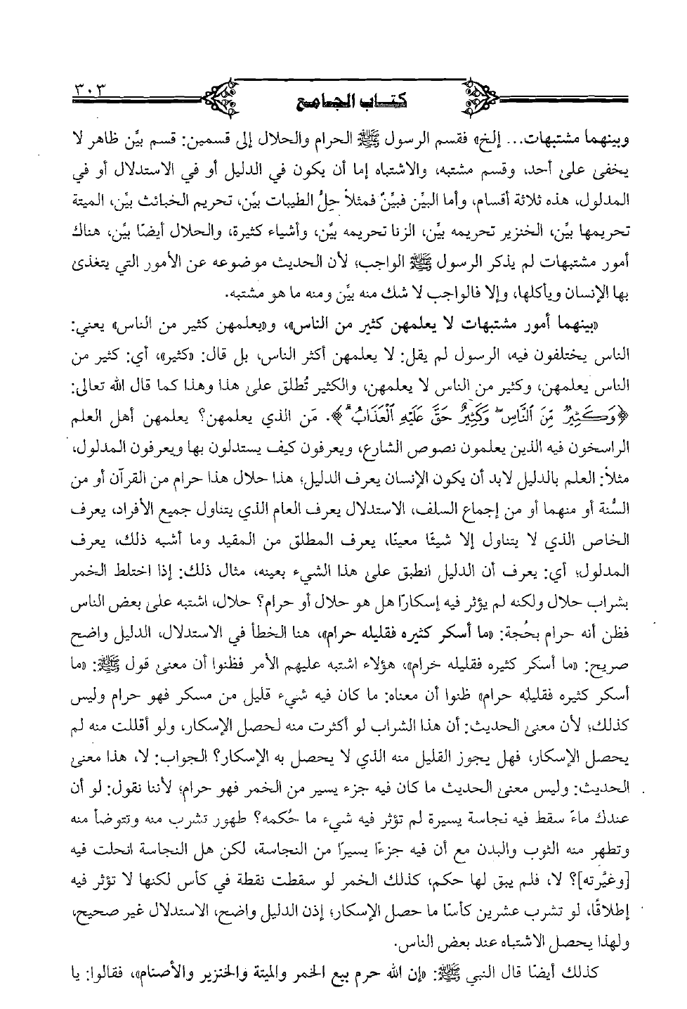 وبينهما مشتبهات ... إلخ» فقسم الرسول (صلى الله عليه وسلم) الحرام والحلال إلى قسمين: قسم بين ظاهر لا يخفى على أحد، وقسم مشتبه، والاشتباه إما أن يكون في الدليل أو في الاستدلال أو في المدلول، هذه ثلاثة أقسام، وأما البين فبين فمثلا حل الطيبات بين، تحريم الخبائث بين، الميتة تحريمها بين، الخنزير تحريمه بين، الزنا تحريمه بين، وأشياء كثيرة، والحلال أيضا بين، هناك أمور مشتبهات لم يذكر الرسول (صلى الله عليه وسلم) الواجب؛ لأن الحديث موضوعه عن الأمور التي يتغذى بها الإنسان ويأكلها، وإلا فالواجب لاشك منه بين ما هو مشتبه. «بينهما أمور مشتبهات لا يعلمهن كثير من الناس»، و «يعلمهن كثير من الناس» يعني: الناس يختلفون فيه، الرسول لم يقل: لا يعلمهن أكثر الناس، بل قال «كثير»، أي: كثير من الناس يعلمهن، والكثير تطلق على هذا وهذا كما قال الله تعالى: {وَكَثِيرٌ مِّنَ النَّاسِ وَكَثِيرٌ حَقَّ عَلَيْهِ الْعَذَابُ} [الحج: 18]. من الذي يعلمهن؟ يعلمهن أهل العلم الراسخون فيه الذين يعلمون نصوص الشارع، ويعرفون كيف يستدلون بها ويعرفون المدلول، مثلا: العلم بالدليل لابد أن يكون الإنسان يعرف الدليل؛ هذا حلال هذا حرام من القرآن أو من السنة أو منهما أو من إجماع السلف، الاستدلال يعرف العام الذي يتناول جميع الأفراد، يعرف الخاص الذي لا يتناول إلا شيئاً معيناً، يعرف المطلق من المقيد وما أشبه ذلك، يعرف المدلول؛ أي: يعرف أن الدليل أنطبق على هذا الشيء بعينه، مثال ذلك: إذا اختلط الخمر بشراب حلال ولكنه لم يؤثر فيه إسكاراً هل هو حلال أو حرام؟ حلال، اشتبه على بعض الناس فظن أنه حرام بحجة: «ما أسكر كثيرة فقليله حرام»، هنا الخطأ في الاستدلال، الدليل واضح صريح: «ما أسكر كثيرة فقليله حرام»، هؤلاء اشتبه عليهم الأمر فظنوا أن معنى قول (صلى الله عليه وسلم): «ما أسكر كثيرة فقليله حرام» ظنوا أن معناه: ما كان فيه شيء قليل من مسكر فهو حرام وليس كذلك؛ لأن معنى الحديث: أن هذا الشراب لو أكثرت منه لحصل الإسكار، ولو أقللت منه لم يحصل الإسكار، فهل يجوز القليل منه الذي لا يحصل به الإسكار؟ الجواب: لا، هذا معنى الحديث: وليس معنى الحديث ما كان فيه جزء يسير من الخمر فهو حرام، لأننا نقول: لو أن عندك ماء سقط فيه نجاسة يسيرة لم تؤثر فيه شيء ما حكمه؟ طهور تشرب منه وتتوضأ منه وتطهر منه الثوب والبدن مع أن فيه جزءاً يسيراً من النجاسة، لكن هل النجاسة انحلت فيه [وغيرته]؟ لا، فلم يبق لها حكم، كذلك الخمر لو سقطت نقطة في كأس لكنها لا تؤثر فيه إطلاقا، لو تشرب عشرين كأسا ما حصل الإسكار، إذن الدليل واضح، الاستدلال غير صحيح، ولهذا يحصل الاشتباه عند بعض الناس. كذلك أيضا قال النبي (صلى الله عليه وسلم): «إن الله حرم بيع الخمر والميتة والخنزير والأصنام»، فقالوا: يا