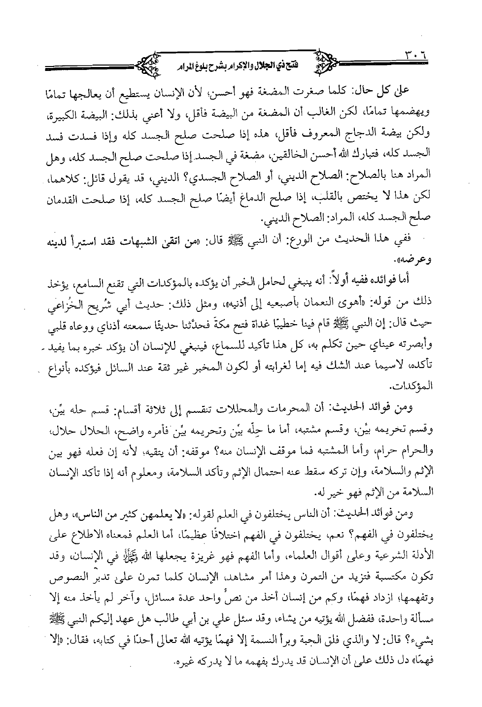 على كل حال: كلما صغرت المضغة فهو أحسن، لأن الإنسان يستطيع أن يعالجها تماماً ويهضمها تماماً، لكن الغالب أن المضغة من البضة فأقل، ولا أعني بذلك: البيضة الكبيرة، ولكن بيضة الدجاج المعروف فأقل، هذه إذا صلحت صلح الجسد كله وإذا فسدت فسد الجسد كله، فتبارك الله أحسن الخالقين، مضغة في الجسد إذا صلحت صلح الجسد كله، وهل المراد هنا بالصلاح: الصلاح الديني، أو الصلاح الجسدي؟ الديني، قد يقول قائل: كلاهما، لكن هذا لا يختص بالقلب، إذا صلح الدماغ أيضاً صلح الجسد كله، إذا صلحت القدمان صلح الجسد كله، المراد: الصلاح الديني. ففي هذا الحديث من الورع: أن النبي (صلى الله عليه وسلم) قال: «من اتقى الشبهات فقد استبرأ لدينه وعرضه». أما فوائده ففيه أولاً: أنه ينبغي لحامل الخبر أن يؤكده بالمؤكدات التي تقنع السامع، يؤخذ ذلك من قوله: «أهوى النعمان بأصبعيه إلى أذنيه»، ومثل ذلك: حديث أبي شريح الخزاعي حيث قال: إن النبي (صلى الله عليه وسلم) قام فينا خطيباً غداة فتح مكة فحدثنا حديثاً سمعته أذناي ووعاه قلبي وأبصرته عيناي حين تكلم به، كل هذا تأكيد للسماع، فينبغي للإنسان أن يؤكد خبره بما يفيد تأكده، لاسيما عند الشك فيه إما لغرابته أو لكون المخبر غير ثقة عند السائل فيؤكده بأنواع المؤكدات. ومن فوائد الحديث: أن المحرمات والمحللات تنقسم إلى ثلاثة أقسام: قسم حله بين، وقسم تحريمه بين، وقسم مشتبه، أما ما حله بين وتحريمه بين فأمره واضح، الحلال حلال، والحرام حرام، وأما المشتبه فما موقف الإنسان منه؟ موقفه: أن يتقيه، لأنه إن فعله فهو بين الإثم والسلامة، وإن تركه سقط عنه احتمال الإثم وتأكد السلامة، ومعلوم أنه إذا تأكد الإنسان السلامة من الإثم فهو خير له. ومن فوائد الحديث: أن الناس يختلفون في العلم لقوله: «لا يعلمهن كثير من الناس»، وهل يختلفون في الفهم؟ نعم، يختلفون في الفهم اختلافاً عظيماً، أما العلم فمعناه الاطلاع على الأدلة الشرعية وعلى أقوال العلماء، وأما الفهم فهو غريزة يجعلها الله (عز وجل) في الإنسان، وقد تكون مكتسبة فتزيد من التمرن وهذا أمر مشاهد، الإنسان كلما تمرن على تدبر النصوص وتفهمها؛ ازداد فهماً، وكم من إنسان أخذ من نص واحد عدة مسائل، وآخر لم يأخذ منه إلا مسألة واحدة، ففضل الله يؤتيه من يشاء، وقد سئل علي بن أبي طالب هل عهد إليكم النبي (صلى الله عليه وسلم) بشيء؟ قال: لا والذي فلق الحبة وبرأ النسمة إلا فهماً يؤتيه الله تعالى أحداً في كتابه، فقال: «إلا فهماً» دل ذلك على أن الإنسان قد يدرك بفهمه ما لا يدركه غيره.
