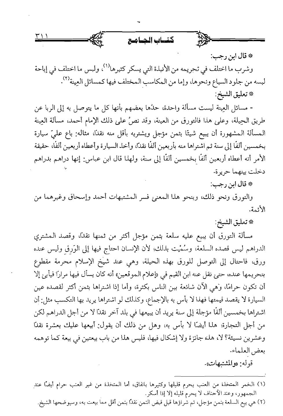مسألة التورق أن يبيع عليه سلعة بثمن مؤجل أكثر من ثمنها نقداً، وقصد المشتري الدراهم ليس قصده السلعة، وسميت بذلك؛ لأن الإنسان احتاج فيها إلى الورق وليس عنده ورق، فاحتال إلى التوصل للورق بهذه الحيلة، وهي عند شيخ الإسلام محرمة مقطوع بتحريمها عنده، حتى نقل عنه ابن القيم في «إعلام الموقعين» أنه كان يسأل فيها مراراً فيأبى إلا أن تكون حراماً، وهي الآن شائعة بين الناس بكثرة، وأما إذا اشتراها بثمن أكثر لقصده عين السيارة لا يقصد قيمتها فهذا لا بأس به بالإجماع، وكذلك لو اشتراها يريد بها التكسب مثل: أن اشتراها بخمسين ألفاً مؤجلة إلى سنة يريد أن يبيعها في بلد آخر نقداً لا من أجل الدراهم لكن من أجل التجارة؛ هذا أيضا لا بأس به، وهل من ذلك أن يقول: أبيعها عليك بعشرة نقداً وعشرين نسيئة؟ لا، هذه جائزة ولا إشكال فيها، فليس هذا من باب بيعتين في بيعة كما توهمه بعض العلماء. قوله: «والمشتبهات».