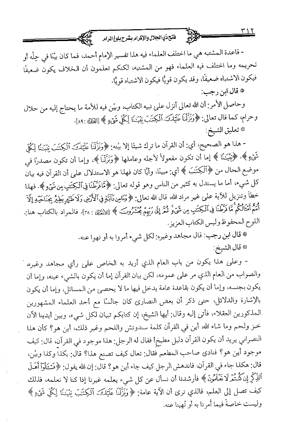 -هذا هو الصحيح: أي: أن القرآن ما ترك شيئاً إلا بينه: {وَنَزَّلْنَا عَلَيْكَ الْكِتَابَ تِبْيَاناً لِّكُلِّ شَيْءٍ}. {تِبْيَاناً} إما أن تكون مفعولاً لأجله وعاملها {وَنَزَّلْنَا}، وإما أن تكون مصدراً في موضع الحال من {الْكِتَابَ} أي: ميناً، وأيا كان فهذا هو الاستدلال على أن القرآن فيه بيان كل شيء، أما ما يستدل به كثير من الناس وهو قوله تعالى: {مَا فَرَّطْنَا فِي الْكِتَابِ مِنْ شَيْءٍ} [الأنعام: 38]. فهذا خطأ وتنزيل للآية على غير مراد الله، قال الله تعالى: {وَمَا مِنْ دَابَّةٍ فِي الأَرْضِ وَلا طَائِرٍ يَطِيرُ بِجَنَاحَيْهِ إِلا أُمَمٌ أَمْثَالُكُمْ مَا فَرَّطْنَا فِي الْكِتَابِ مِنْ شَيْءٍ ثُمَّ إِلَى رَبِّهِمْ يُحْشَرُونَ} [الأنعام: 38]. فالمراد بالكتاب هنا: اللوح المحفوظ وليس الكتاب العزيز.