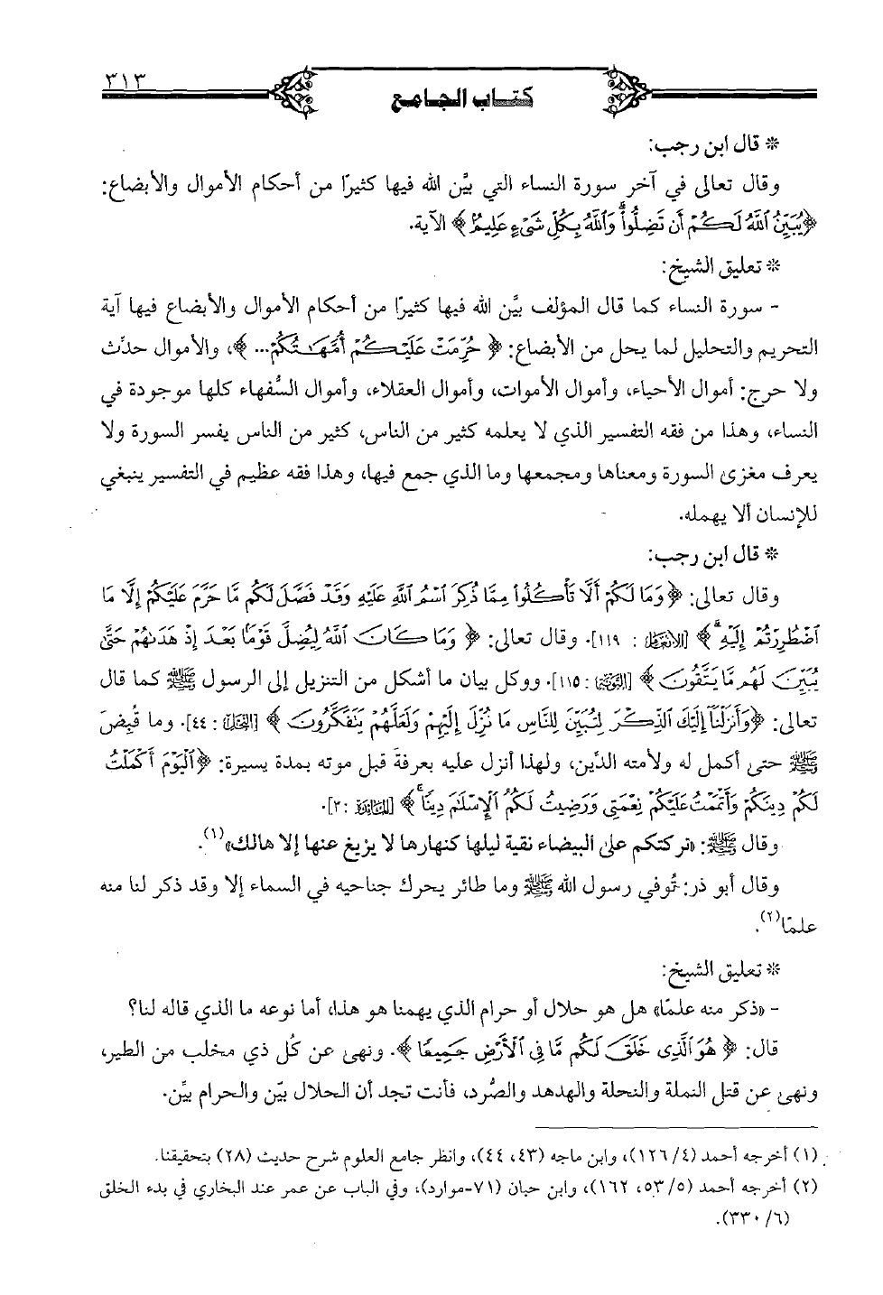 -سورة النساء كما قال المؤلف بين الله فيها كثيرا من أحكام الأموال والأبضاع فيه آية التحريم والتحليل لما يحل من الأبضاع: {حُرِّمَتْ عَلَيْكُمْ أُمَّهَاتُكُمْ وَبَنَاتُكُمْ} [النساء: 23]، والأموال حدث ولا حرج: أموال الأحياء، وأموال الأموات، وأموال العقلاء، وأموال السفهاء كلها موجودة في النساء، وهذا من فقه التفسير الذي لا يعلمه كثير من الناس، كثير من الناس يفسر السورة ولا يعرف مغزى السورة ومعناها ومجمعها وما الذي جمع فيها، وهذا فقه عظيم في التفسير ينبغي للإنسان ألا يهمله.