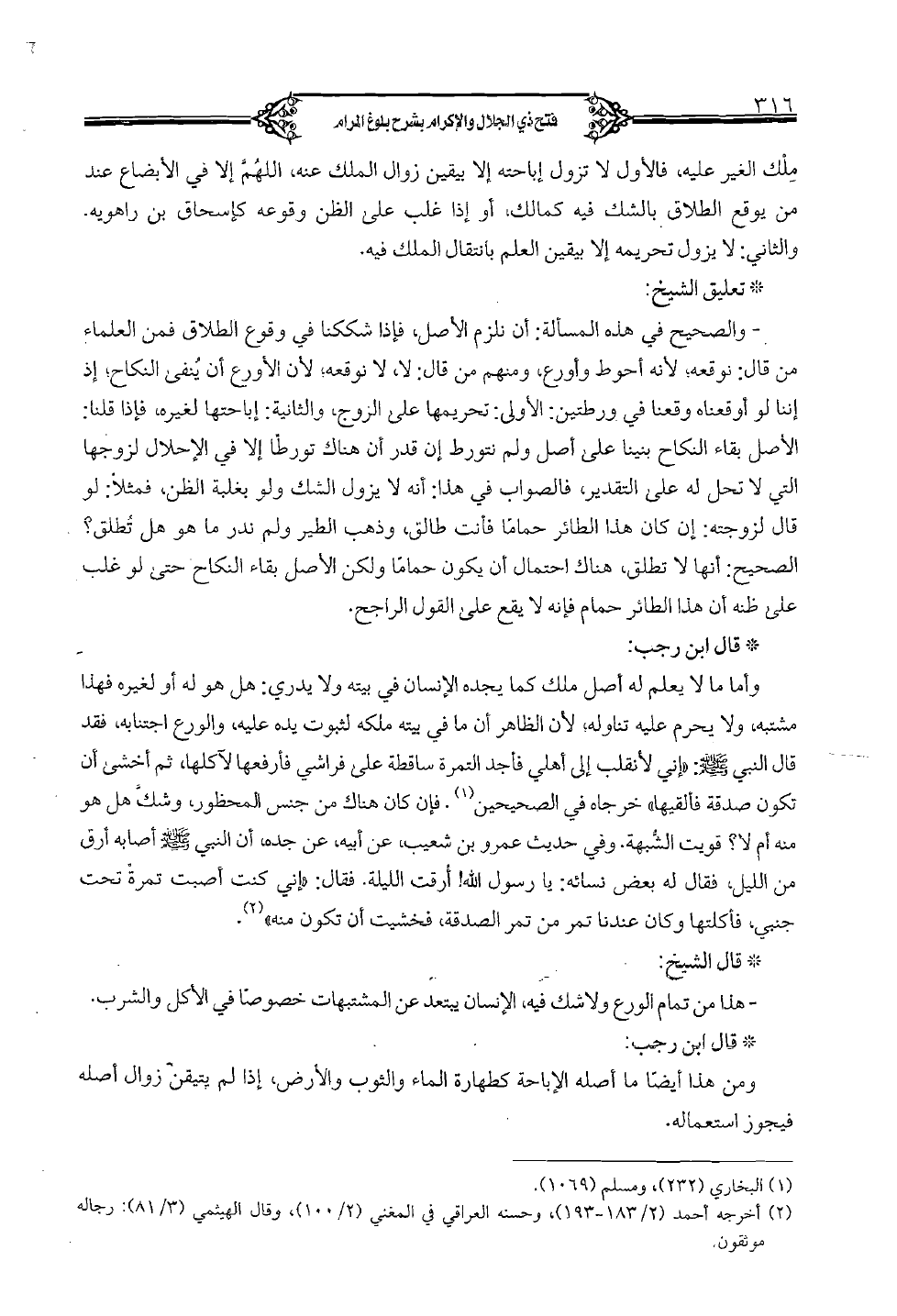 ملك الغير عليه، فالأول لا تزول إباحته إلا بيقين زوال الملك عنه، اللهم إلا في الأبضاع عند من يوقع الطلاق بالشك فيه كمالك، أو إذا غلب على الظن وقوعه كإسحاق بن راهويه. والثاني: لا يزول تحريمه إلا بيقين العلم بانتقال الملك فيه.