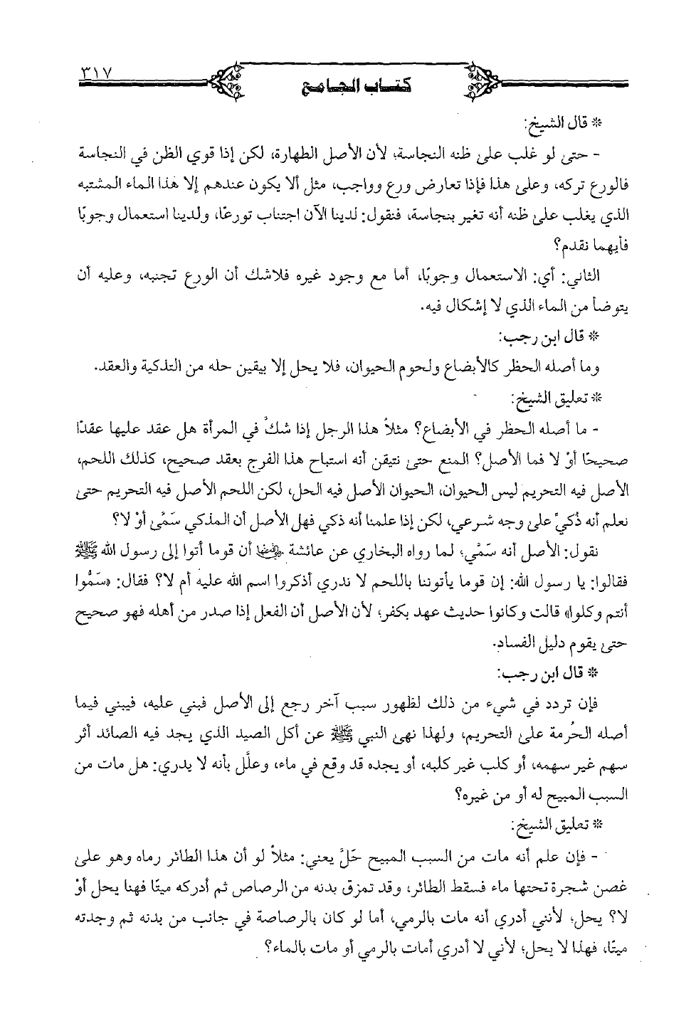فإن تردد في شيء من ذلك لظهور سبب آخر رجع إلى الأصل فبني عليه، فيبني فيما أصله الحرمة على التحريم، ولهذا نهى النبي (صلى الله عليه وسلم) عن أكل الصيد الذي يجد فيه الصائد أثر سهم غير سهمه، أو كلب غير كلبه، أو يجده قد وقع في ماء، وعلل بأنه لا يدري: هل مات من السبب المبيح له أو من غيره؟
