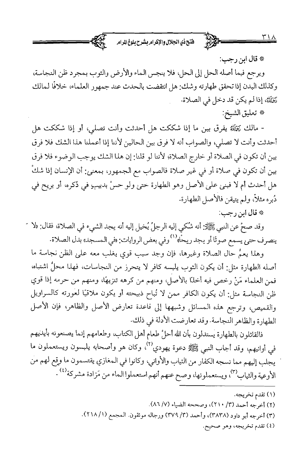 وقد صح عن النبي (صلى الله عليه وسلم): أنه شكي إليه الرجل يخيل إليه أنه يجد الشيء في الصلاة، فقال: «لا ينصرف حتى يسمع صوتاً أو يجد ريحاً» وفي بعض الروايات: «في المسجد» بدل الصلاة. وهذا يعم حال الصلاة وغيرها، فإن وجد سبب قوي يغلب معه على الظن نجاسة ما أصله الطهارة مثل: أن يكون الثوب يلبسه كافر لا يتحرز من النجاسات، فهذا محل اشتباه، فمن العلماء من رخص فيه أخذا بالأصل، ومنهم من كرهه تنزيها، ومنهم من حرمه إذا قوى ظن النجاسة مثل: أن يكون الكافر ممن لا تباح ذبيحته أو يكون ملاقياً لعورته كالسراويل والقميص، وترجع هذه المسائل وشبهها إلى قاعدة تعارض الأصل والظاهر، فإن الأصل الطهارة والظاهر النجاسة. وقد تعارضت الأدلة في ذلك. فالقائلون بالطهارة يستدلون بأن الله أحل طعام أهل الكتاب، وطعامهم إنما يصنعونه بأيديهم في أوانيهم، وقد أجاب النبي (صلى الله عليه وسلم) دعوة يهودي، وكان هو وأصحابه يلبسون ويستعملون ما يجلب إليهم مما نسجه الكفار من الثياب والأواني، وكانوا في المغازي يقتسمون ما وقع لهم من الأوعية والثياب، ويستعملونها، وصح عنهم أنهم استعملوا الماء من مزادة مشركة.