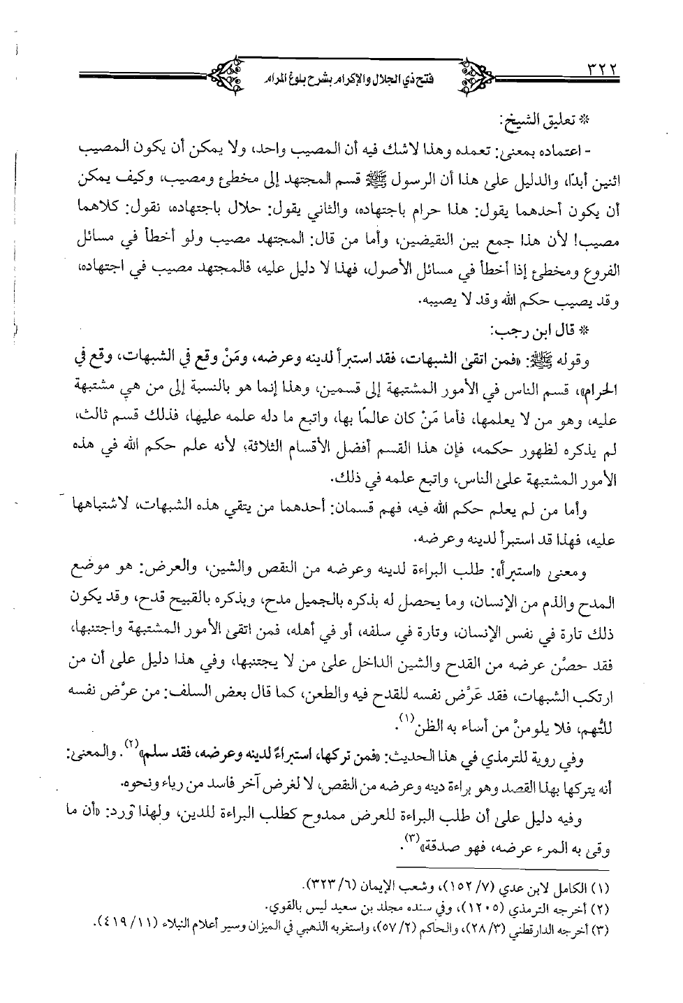 وقوله (صلى الله عليه وسلم): «فمن اتقى الشبهات، فقد استبرأ لدينه وعرضه، ومن وقع في الشبهات، وقع في الحرام»، قسم الناس في الأمور المشتبهة إلى قسمين، وهذا إنما هو بالنسبة إلى من هي مشتبهة عليه، وهو من لا يعلمها، فأما من كان عالماً بها، واتبع ما دله علمه عليها، فذلك قسم ثالث، لم يذكره لظهور حكمه، فإن هذا القسم أفضل الأقسام الثلاثة؛ لأنه علم حكم الله في هذه الأمور المشتبهة على الناس، واتبع علمه في ذلك. وأما من لم يعلم حكم الله فيه، فهم قسمان: أحدهما من يتقي هذه الشبهات، لاشتباهها عليه، فهذا قد استبرأ لدينه وعرضه. ومعنى «استبرأ»: طلب البراءة لدينه وعرضه من النقص والشين، والعرض: هو موضع المدح والذم من الإنسان، وما يحصل له بذكره بالجميل مدح، وبذكره بالقبيح قدح، وقد يكون ذلك تارة في نفس الإنسان، وتارة في سلفه، أو في أهله، فمن اتقى الأمور المشتبهة واجتنبها، فقد حصن عرضه من القدح والشين الداخل على من لا يجتنبها، وفي هذا دليل على أن من ارتكب الشبهات، فقد عرض نفسه للقدح فيه والطعن، كما قال بعض السلف: من عرض نفسه للتهم، فلا يلو منَّ من أساء به الظن. وفي روية للترمذي في هذا الحديث: «». والمعنى: أنه يتركها بهذا القصد وهو براءة دينه وعرضه من النقص، لا لغرض آخر فاسد من رياء ونحوه. وفيه دليل على أن طلب البراءة للعرض ممدوح كطلب البراءة للدين، ولهذا ورد: «أن ما وقى به المرء عرضه، فهو صدقة».