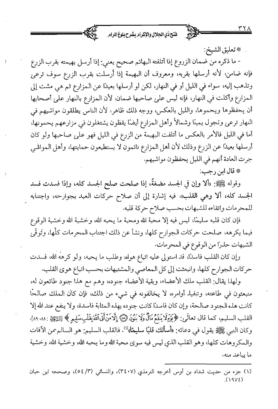 وقوله (صلى الله عليه وسلم): «ألا وإن في الجسد مضغة، إذا صلحت صلح الجسد كله، وإذا فسدت فسد الجسد كله، ألا وهي القلب»، فيه إشارة إلى أن صلاح حركات العبد بجوارحه، واجتنابه للمحرمات واتقاء للشبهات بحسب صلاح حركة قلبه. فإن كان قلبه سليماً، ليس فيه إلا محبة الله ومحبة ما يحبه الله، وخشية الله وخشية الوقوع فيما يكرهه، صلحت حركات الجوارح كلها، ونشأ عن ذلك اجتناب المحرمات كلها، وتوقى الشبهات حذراً من الوقوع في المحرمات. وإن كان القلب فاسداً، قد استولى عليه إتباع هواه، وطلب ما يحبه، ولو كرهه الله، فسدت حركات الجوارح كلها، وانبعثت إلى كل المعاصي والمشتبهات بحسب إتباع هوى القلب. ولهذا يقال: القلب ملك الأعضاء، وبقية الأعضاء جنوده، وهم مع هذا جنود طائعون له، منبعثون في طاعته، وتنفيذ أوامره، لا يخالفونه في شيء من ذلك، فإن كان الملك صالحاً كانت هذه الجنود صالحة، وإن كان فاسداً كانت جنوده بهذه المثابة فاسدة، ولا ينفع عند الله إلا القلب السليم، كما قال تعالى: {يَوْمَ لَا يَنْفَعُ مَالٌ وَلَا بَنُونَ (89) إِلَّا مَنْ أَتَى اللَّهَ بِقَلْبٍ سَلِيمٍ} [الشعراء: 89، 88]. وكان النبي (صلى الله عليه وسلم) يقول في دعائه: «أسألك قلباً سليماً». فالقلب السليم: هو السالم من الآفات والمكروهات كلها، وهو القلب الذي ليس فيه سوى محبة الله وما يحبه الله، وخشية الله، وخشية ما يباعد منه.